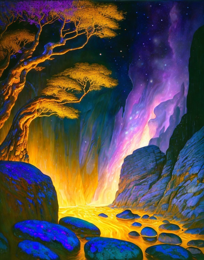 Prompt: "close portrait of glowing unreal animal spirit of night dancing amidst northern living rocks covered with glowing petroglyphs, surrealistic landscape, midnight tones, lightings, high definition by Klimt, Hugo Simberg, Akseli Gallen-kallela, Arkhip Kuindzhi, Bosch; art nouveau surrealistic fantasy painting; ink flowing splash art, extreme detail, oil on canvas, soft brush"