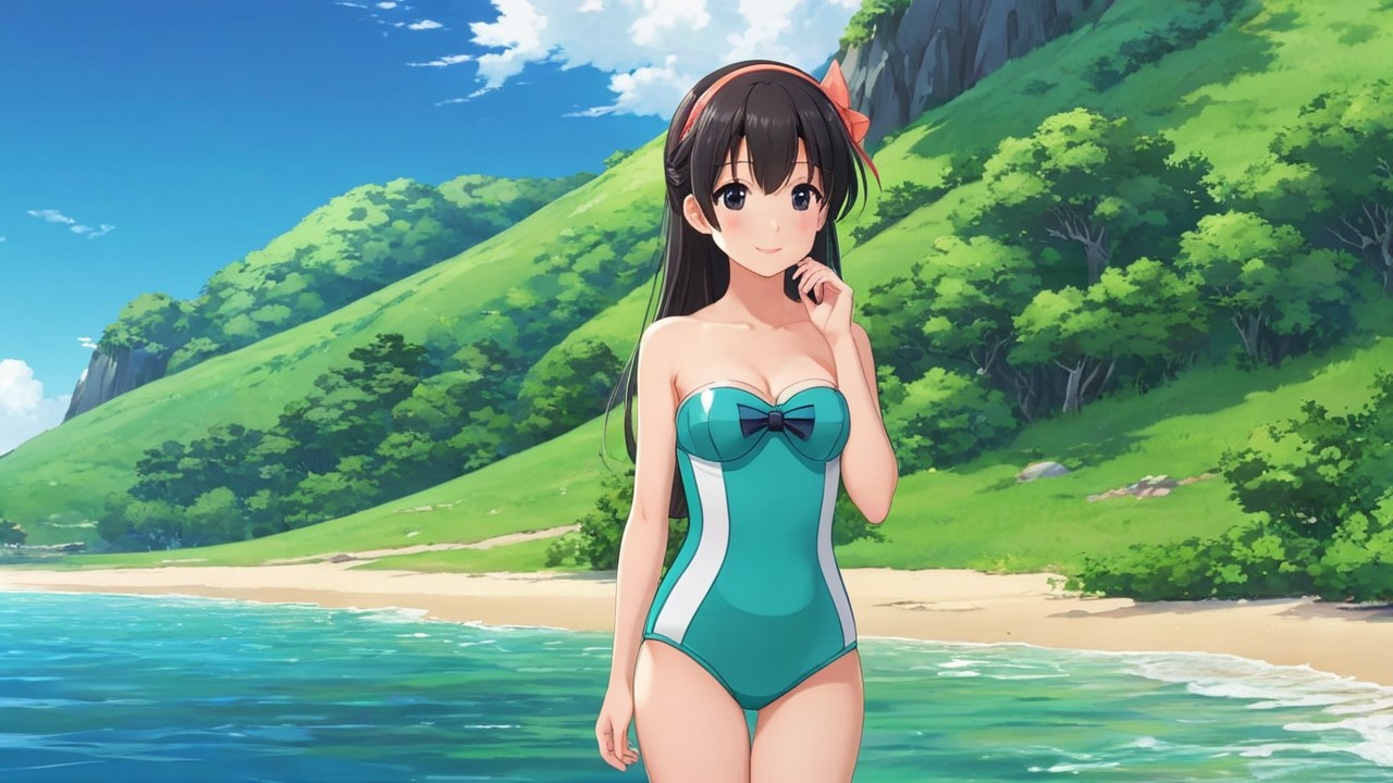 A charming anime character in a strapless swimsuit stands on a picturesque peninsula, surrounded by sparkling blue waters and lush greenery. The scene captures a vibrant, sunny day filled with joy.