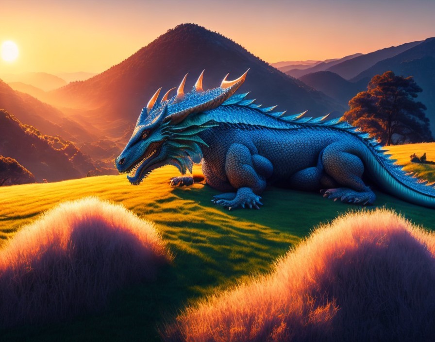 The great dragon sleeps on a spacious meadow in a calm position with his eyes closed. The soft light of the setting sun falls on the dragon. This stunning, ultra-detailed masterpiece conveys a sense of calm and tranquility.