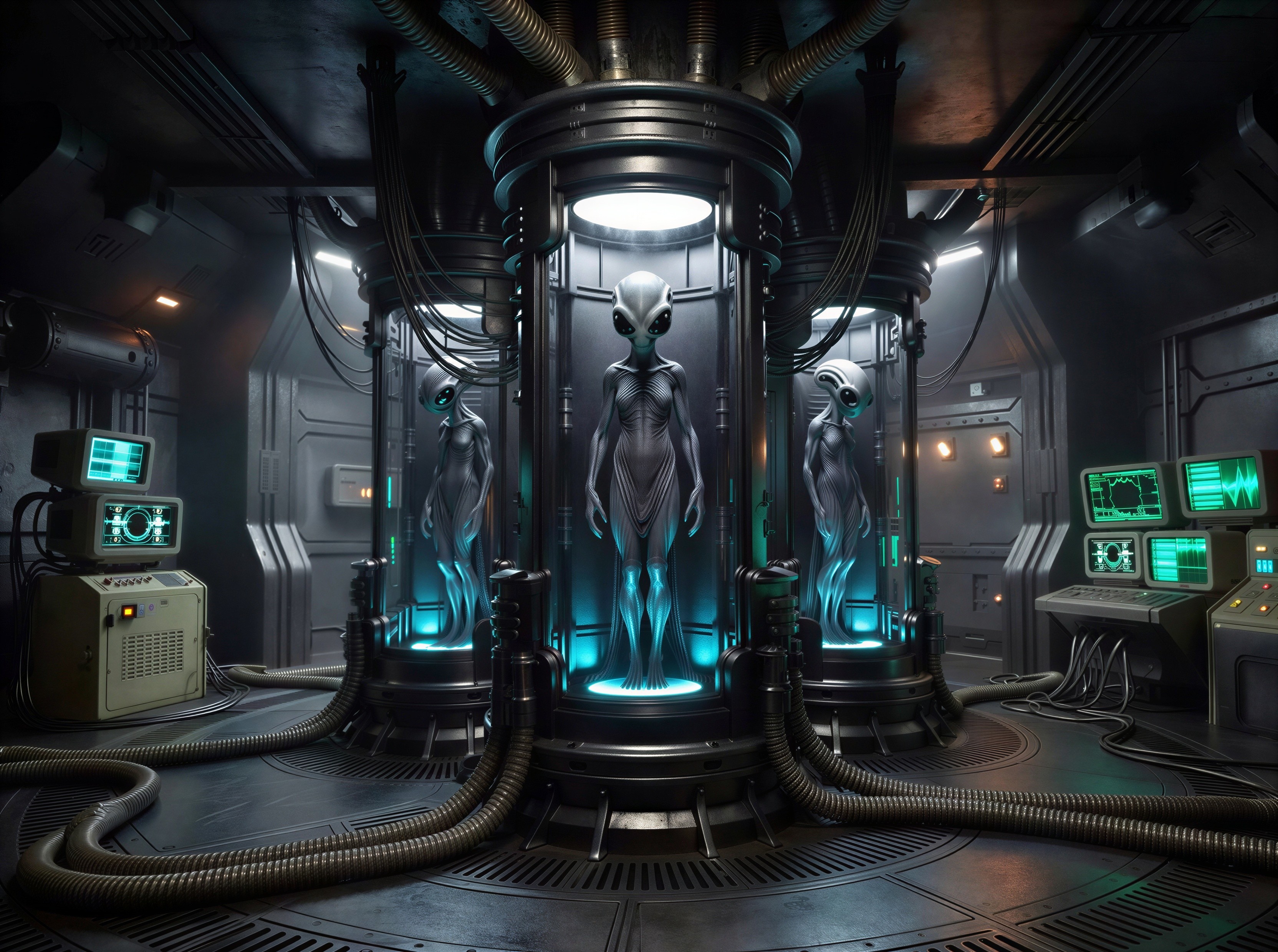 Three grey aliens with large black eyes, standing in individual glass tubes with blue glowing bases, in a dark, metallic, high-tech laboratory with two monitor stations showing green screens and wires, surrounded by pipes and machinery.