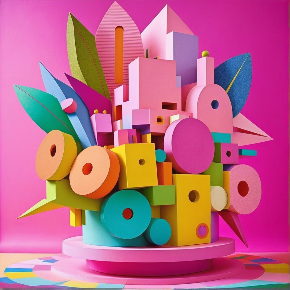 A vibrant, abstract sculpture featuring geometric shapes in bold colors like pink, yellow, and teal. It combines circular and rectangular forms, surrounded by playful leaf-like accents.