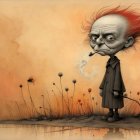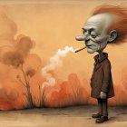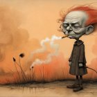 The Smoker ~ Ghouls go haunting, cigarette, Smoke rings, Paul Klee James Jean Anton Pieck Erik Johansson Charles Addams A cartoon resident is a optimist , skinny, disheveled, shaggy, old lady with crazy hair, counting on happiness. Caricature. Like a child's drawing. Minimalism, simplicity, charcoal drawing, whirlwind of colors, red and brown soot, sketching, bleached background, grunge, alcohol ink, play of light and shadow, quick sketch, unusual horror, watercolor, dark art