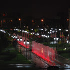 A serene nighttime scene with vibrant street lamps illuminating a path lined by neatly trimmed bushes. Wet pavement reflects the warm lights, creating a picturesque atmosphere.