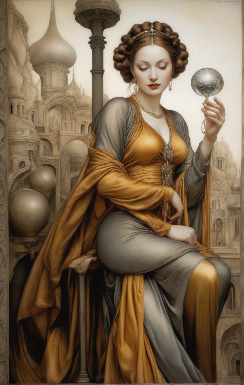 An elegant woman in ornate fantasy attire holds a scepter and orb, with a backdrop of spire-topped buildings.