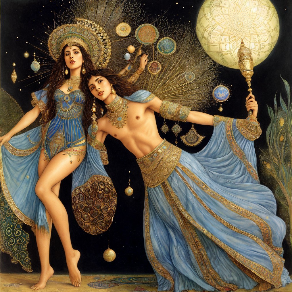 A graceful woman dances against a starry night, adorned in vibrant fabrics and jewelry. Ethereal architecture and a glowing moon enhance the enchanting, dreamlike atmosphere.