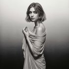 A serene portrait of a young woman with flowing hair and a gentle expression, wrapped in a light blue shawl. The background features swirling colors, suggesting a coastal setting.