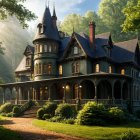 A grand, ornate mansion sits surrounded by lush greenery, with intricate architecture and towering spires. Sunlight filters through trees, casting soft rays onto the vibrant lawn.