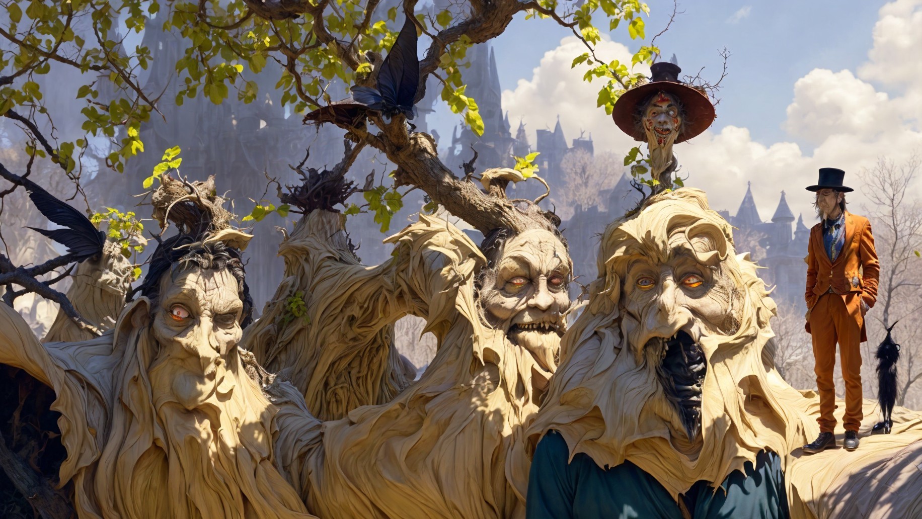 conveys a sense of story about an evil character wannabe that has too much whimsical Seuss-like DNA that he can’t pull off scary menacing persona despite his best efforts & to his great dismay, depiction includes Brian Froud-like vibrantly colored Tree face embedded in the gnarled trunk, thick , mesmerizing wandering branches, intricately lacy leaves & flora & vines that give incredible multidimensional depth, whimsy, personality , structure, color to his vibrantly colored face which has huge symmetrical puppy-dog expressive eyes forlorn expression, downturned mouth, very wispy, crisp & intricate motifs, tracery, intricately multi-layered, long eyelashes, amid a detailed woodlands home back yard, wispy lacy purple & magenta flora & leaves, vibrant deep colors, quirky enchanting cuteness with horror, imaginative genius & character creation, fusion of whimsicality with enough dark art, esoteric symbolism to add edginess, , macabre, film nor vibes, immersive backyard woodland setting, eerie skies, beautiful rich colors Jacek Yerka, fantasycore, aubrey beardsley, Tingatinga art.Arthur Rackham & Jean-Baptiste Monge & Tim Burton