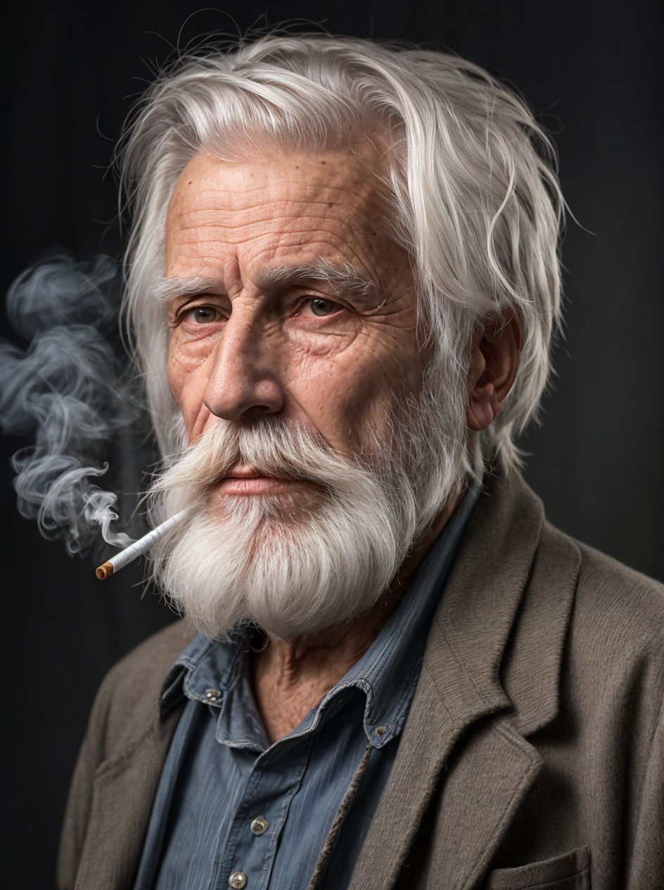 Prompt: portrait of an elderly man, 70 years old, with a beard and white hair, the beard and hair are long, dirty and unkempt, he looks sad and tired, the facial wrinkles are detailed as are the pores of the skin, (he keeps in mouth a cigarette:1.2), (from which a cloud of smoke comes out), he is wearing dirty and worn clothes, in the background a dirty and peeling wall, focused foreground, night, dim light, hd,