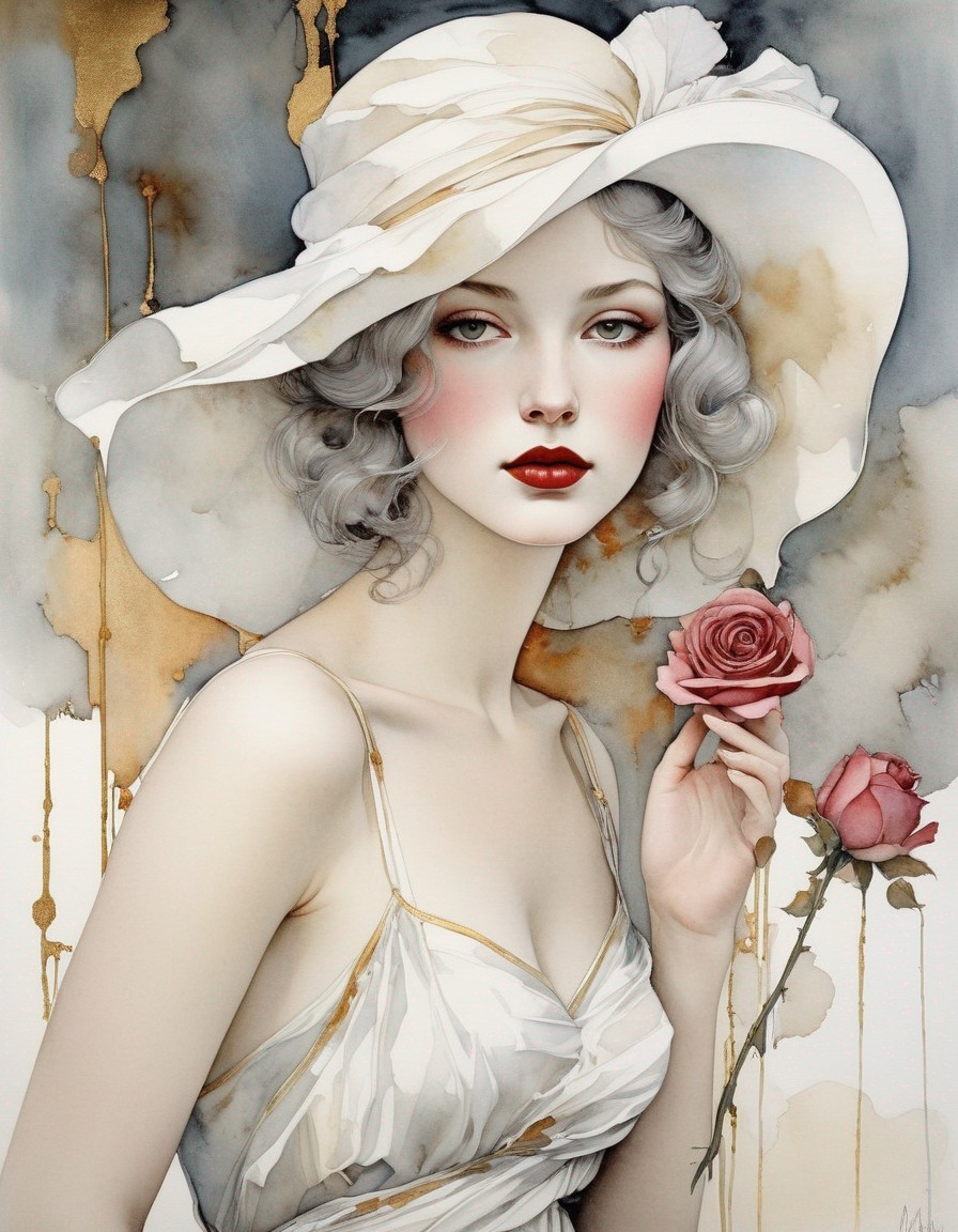 whimsical, beautiful, poignant, touching. colors rose, gold, rust, burgundy, black. soft watercolor extra water in Art Deco by Annigoni, Egon Schiele, Milo Manara, Botticelli, Catrin Welz-Stein, Jean Metzinger, Klimt, perfect eyes, perfect handsface, highly detailed, complementary colors, hyper detailed. Watercolor and ink splatter, dynamic pose,