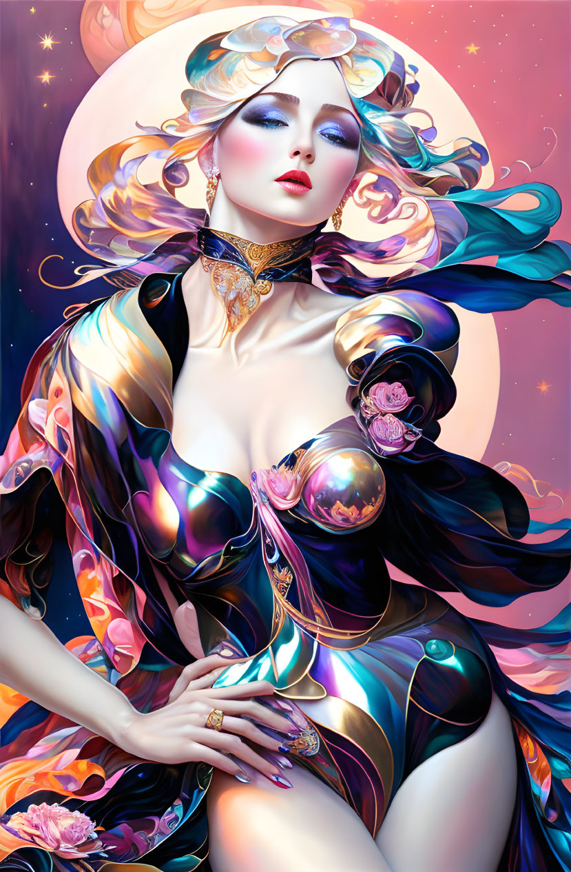 Ethereal woman illustration with flowing hair and cosmic swirls