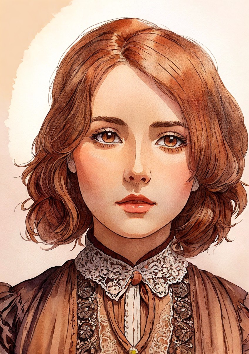 Female in edwardian blouse, fauvistic, upper body portrairure, watercolor and ink sketch, cel-shading, stacked-up view, intricate accuracy, triadic color scheme beige brown auburn, celestial background, tints of chibi, hues, 3d effects 1.8, dynamic lighting 1.7, illustrative stylization art, anisotropic filtering 1.7, raytraced shadows 1.8, sublime, cottagegore 1.9, digital painting, crackle details, atmospheric, coherent, tints of dripping art, tints of 1970s advertising art plushy design, comical essence, Watercolor and ink portraiture, wavery texture on old paper, tints of 1970s advertising art, back-lit, complexion 1.4, radiance, brightness 1.4, style of Brian Duffy, Richard Burlet, Geoff Darrow, Margaret Keane, Georgia O'Keeffe, triadic color scheme grey beige brown, 3d effects 1.8, traumacore 1.7, intricate details, octane render, luminous, mezzotinto, wavery pasture, highcoloring1.9.4, , plasticity 1.6, ambient occlusion 1.5, raytraced shadows 1.8, cottagegore 1.2, octane render, high coloring 1.9, speed painting, tints of comic book art in style of Overton Loyd, beautiful artwork, stylized illustration 1.5, saturated colors 1.5, Pastel colors american gothic 1.7, cottagegore 1.3, dynamic lighting 1.7, beautiful composition 1.9, soft edges, dots and flares and splashes, daguerreotype photography on old paper, cinewash, auracore, cottagegore 1.7, Anglocore 1.7, stylized illustration, complexion 0.7,