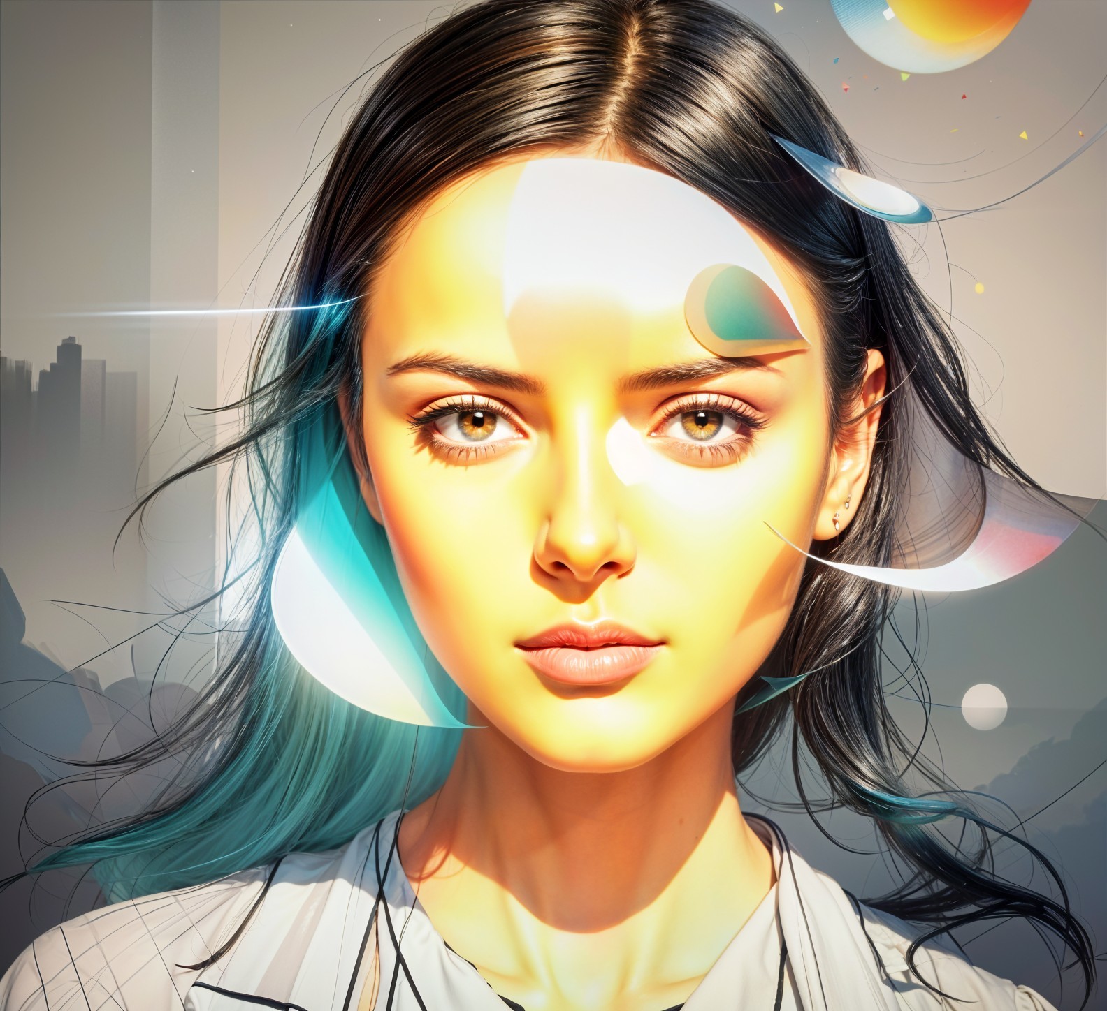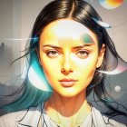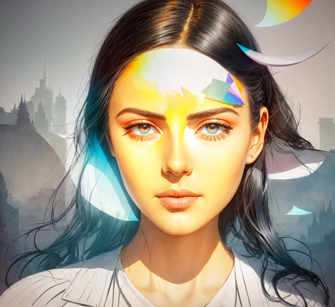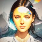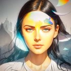 A portrait of a young woman with striking features and colorful abstract elements blending into her hair and background, creating a vibrant and artistic atmosphere.