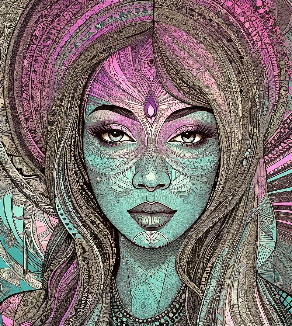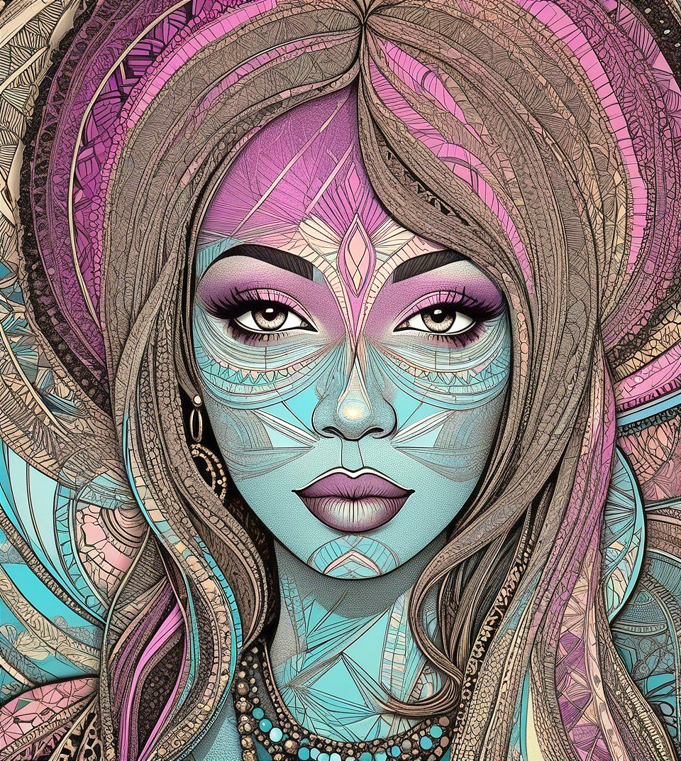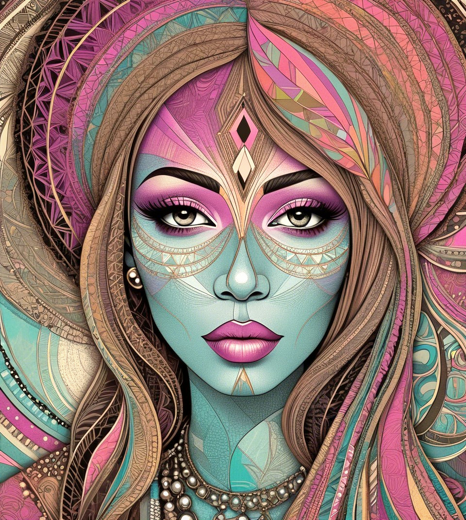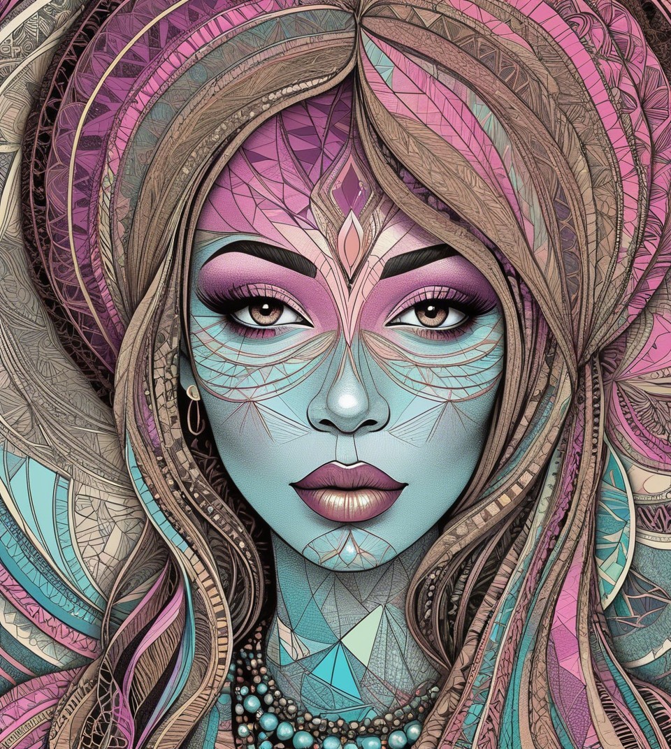 Prompt: Geometric portrait with lineage and line-art fusion, retro psychedelic Juminocore and abstract scratchbook art blend, enchanting lineage illustration featuring a temptress in a comical Harlem Renaissance style, portrayed with a moody expression. Warmly colored sgraffito in zentangle lines reminiscent of Francis Bacon and Georgia O'Keeffe and Jim Davis, lines by William Bradley, divisionism, impossible light transitions, grain, frontal view, angled, champlevé, merged styles of Devin Allen, Jacques de Loustal, Gabriel Pacheco, hues by Overton Loyd, intricate detail, angled, stylized, stippled, tesselated, boasting warm tones, contoured coloring embellishments by Grant Wood, outlines by Emshwiller, embodiment by Arshile Gorky, watery ink effects, digital illustration, pastel hues, expired film, overexposed post-punk style, contouring outlines, artwork is a woodblock print characterized by abstract coherence and only curves in zentangle style, fractalisation, stylization, tesselated, stippled, color spaces, Triadic color scheme light-blue warm beige light-pink. Enchanting Woodblock Print, plasticity 1.3, stylized linocut by Earl Moran. Hues by Georgia O'Keeffe, coloring by Nam Yune Paik and Jay Coby, parallax occlusion 1.3, sawtooth wave, negative lucas numbers, Psychosomatic surrealism by Gayane Khachaturian, warm yellow pastel color palette Embodiment inspired by Ernst Haeckel, micropen and ink lineage in hues, impossible light transitions, liminal, 3D effects, sharp focus, detailed linework, mystical female with gothical allure, intricate tribal patterns with lineage designs. Stan Lee's and Frank Miller's visual flair, portrait features intricate coloring, very smooth complexion, highly detailed, stylized details in geometrical background, flares, zentangle, blotting, overspray of paint,quilling, lineage by ho Baron, lighting by Frankenthaler, liminal, joyful, lineage art, colorful folk art, stylized art, high contrast, style mix of Alex Grey and Emshwiller.Stylized