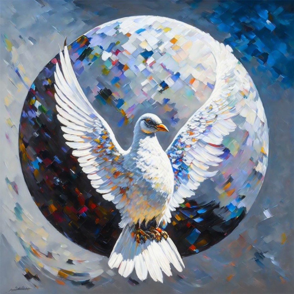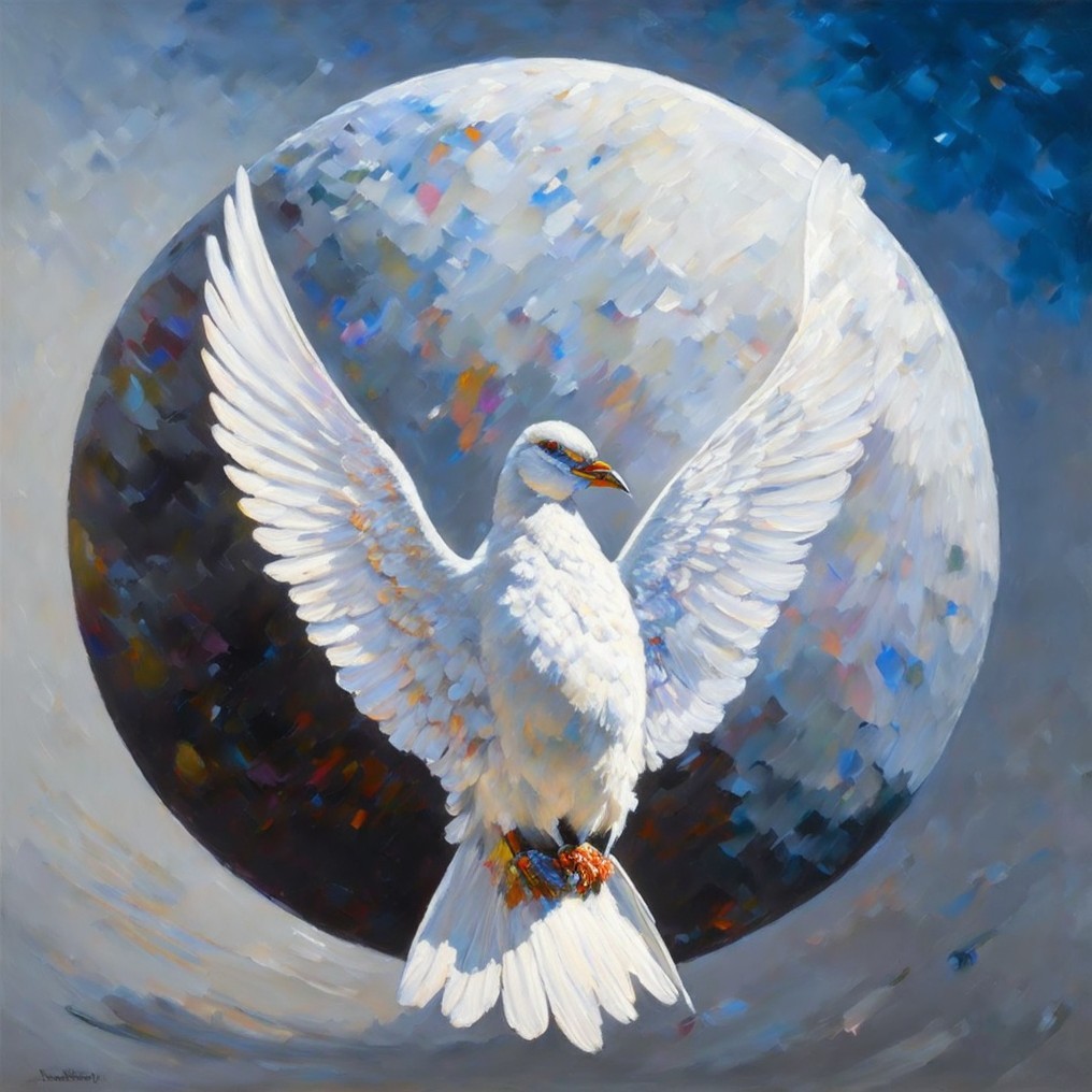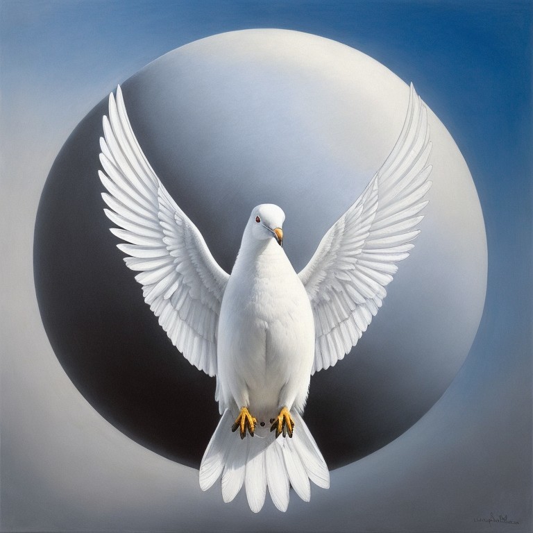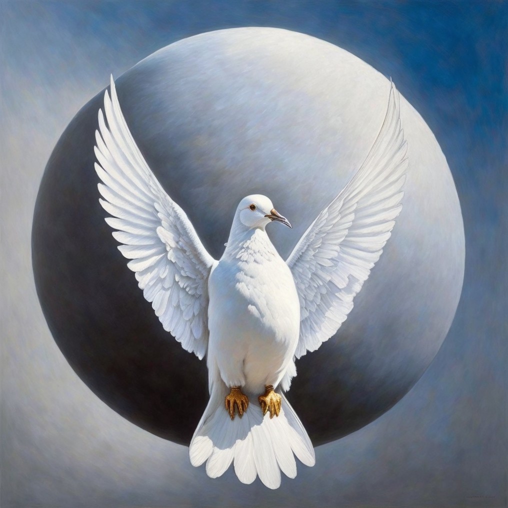 Prompt: "A resting white dove, with hands for wings. The hands reach below the dove and support/hold a globe of the world.