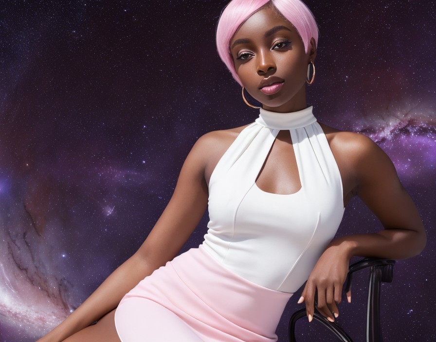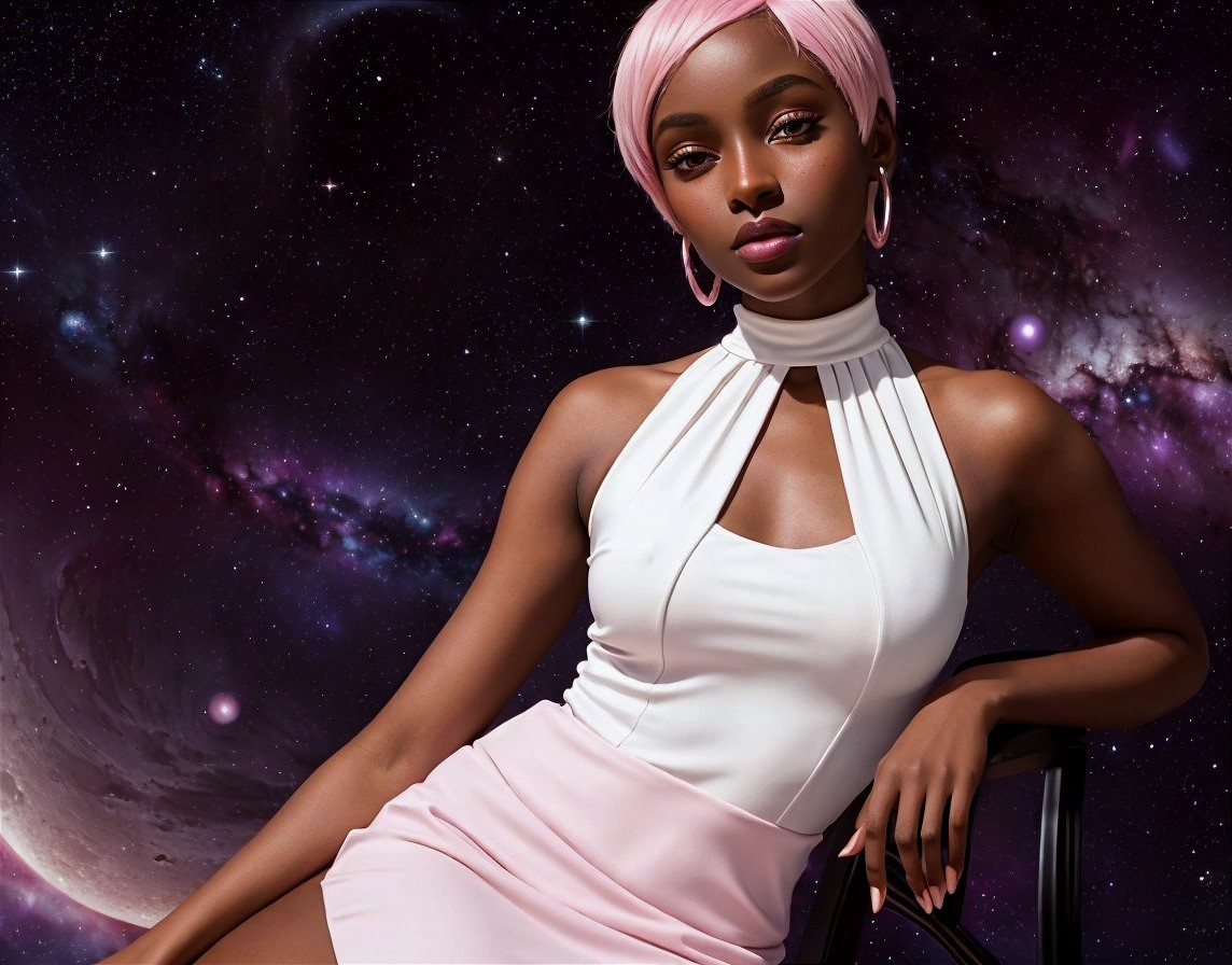 (Try from other user) - A stylish figure poses confidently against a cosmic backdrop, featuring a starry universe. She wears a sleek white top and pink skirt, exuding elegance and modernity in this vibrant scene.