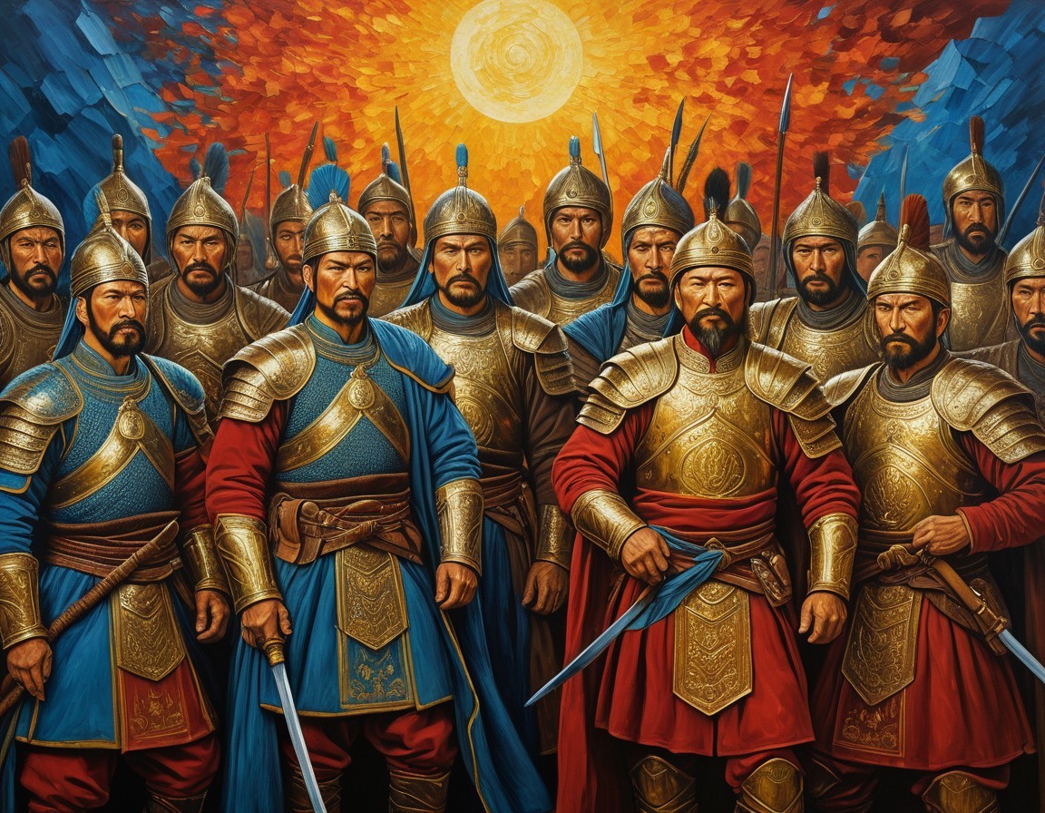 Group of exchange students clad in ornate gold armor and vibrant garments stands proudly against a lavish backdrop, exuding a sense of strength and unity in their majestic attire.