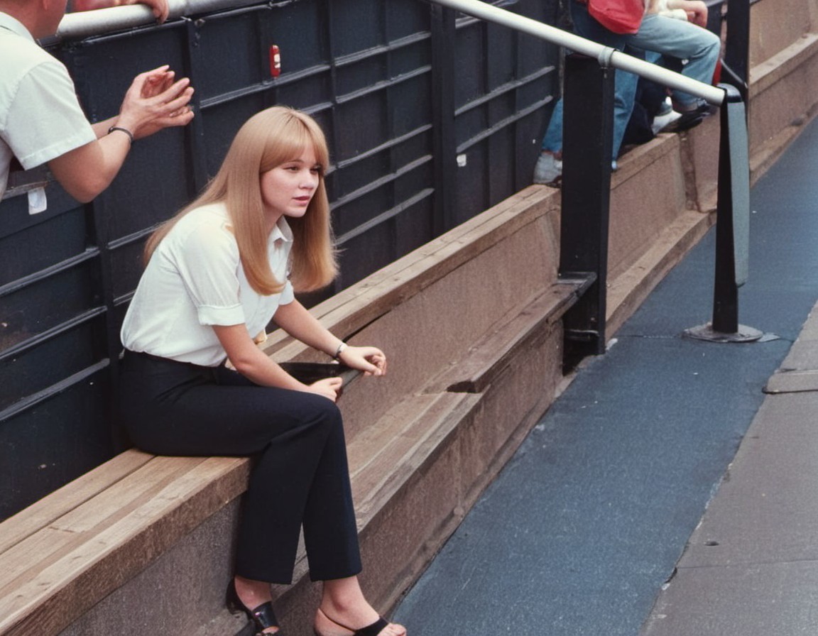 A woman with blonde hair sits on a blue ledge, wearing a beige top and blue trousers, with people in the background.