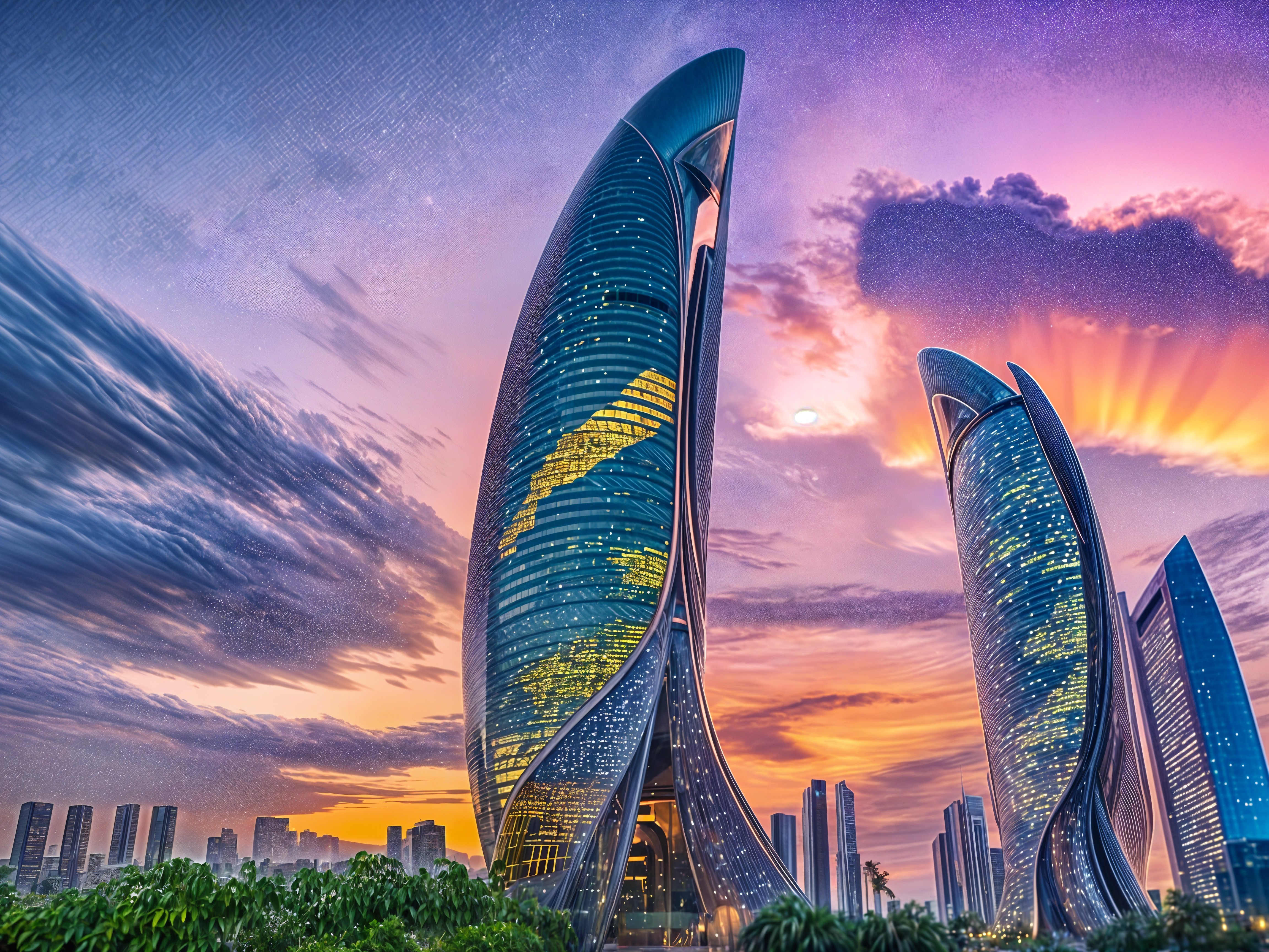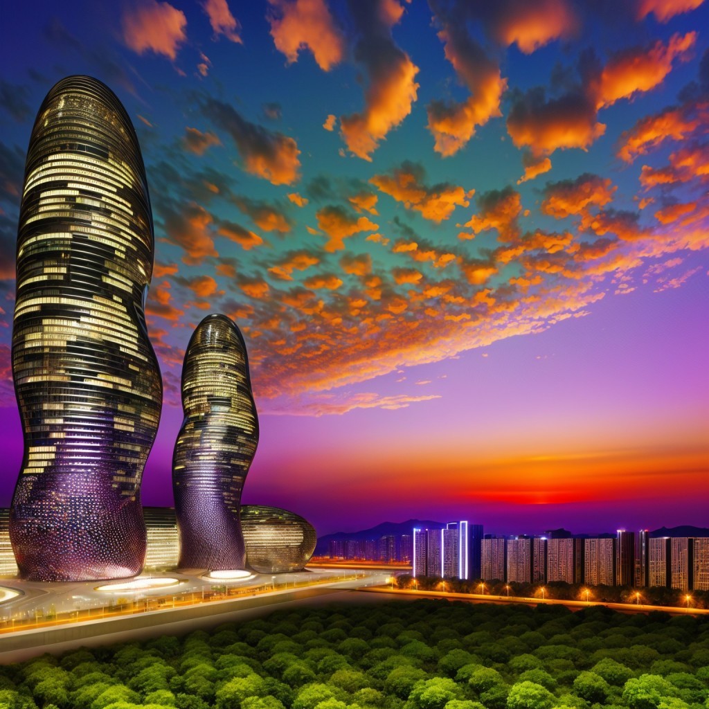 The image showcases a stunning, modern building with a unique, flowing design, set against a vibrant sunset sky filled with colorful clouds and silhouettes of urban structures in the background.