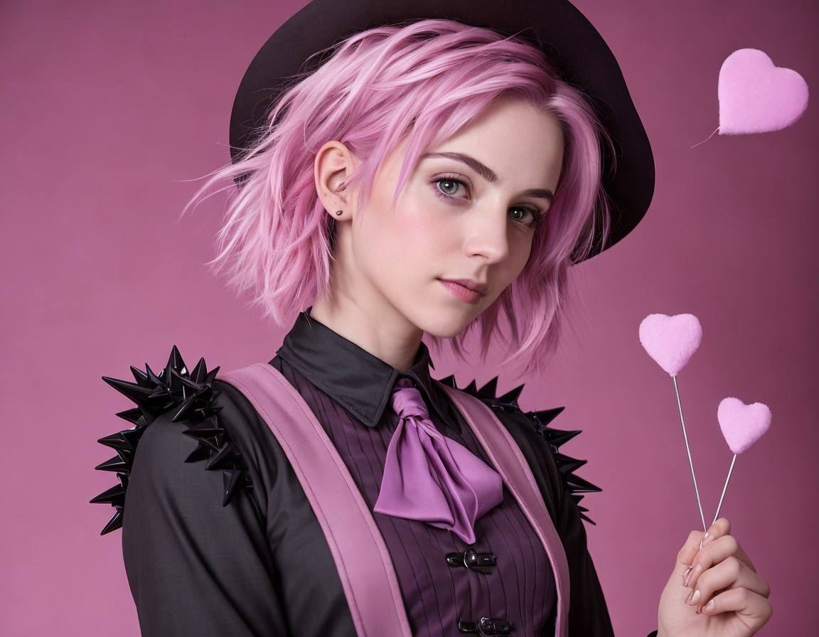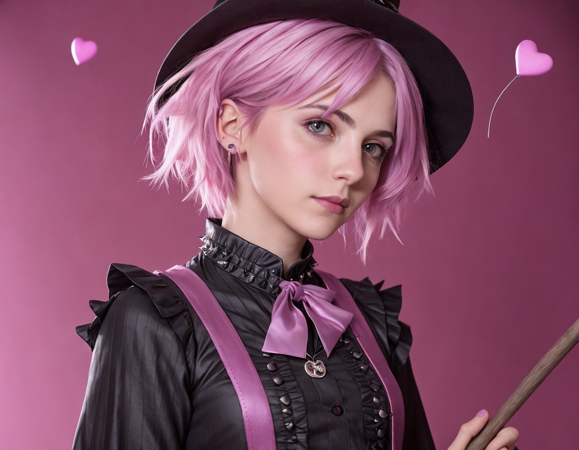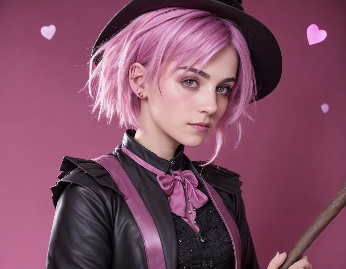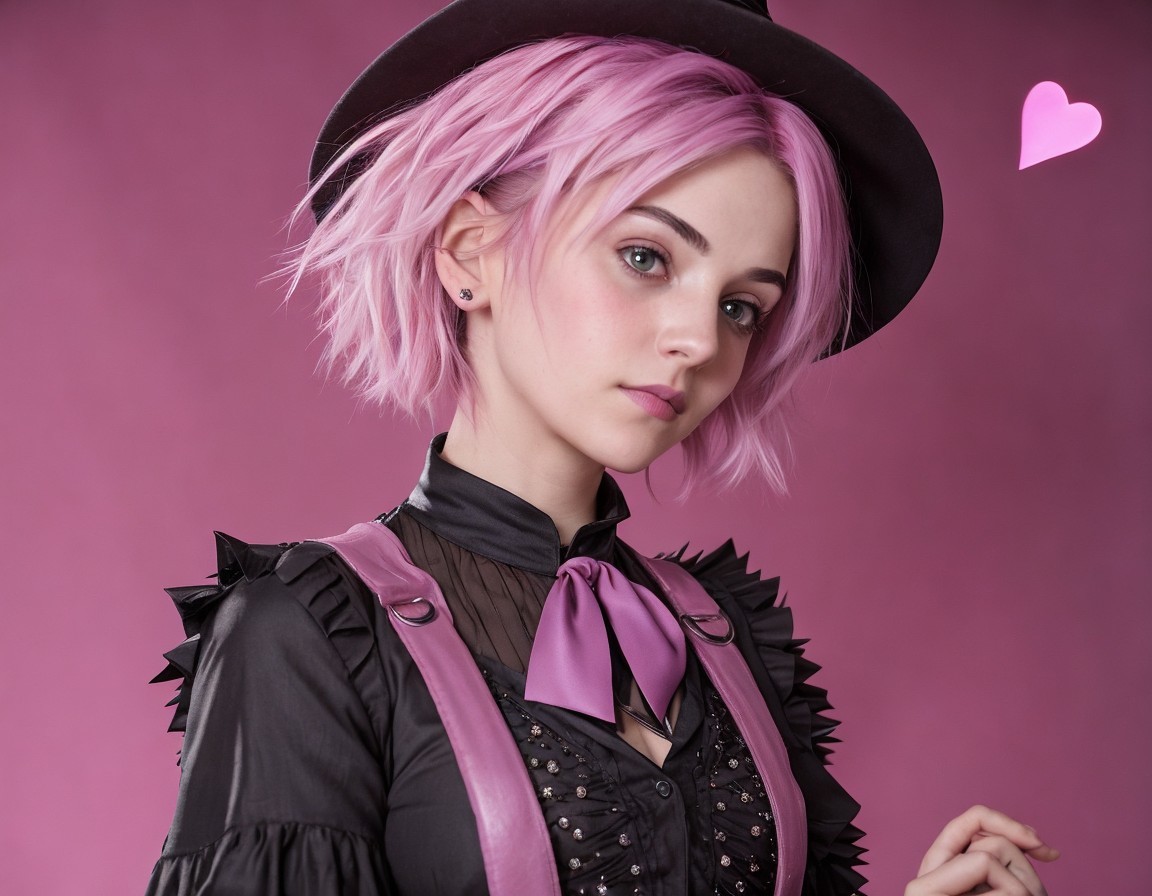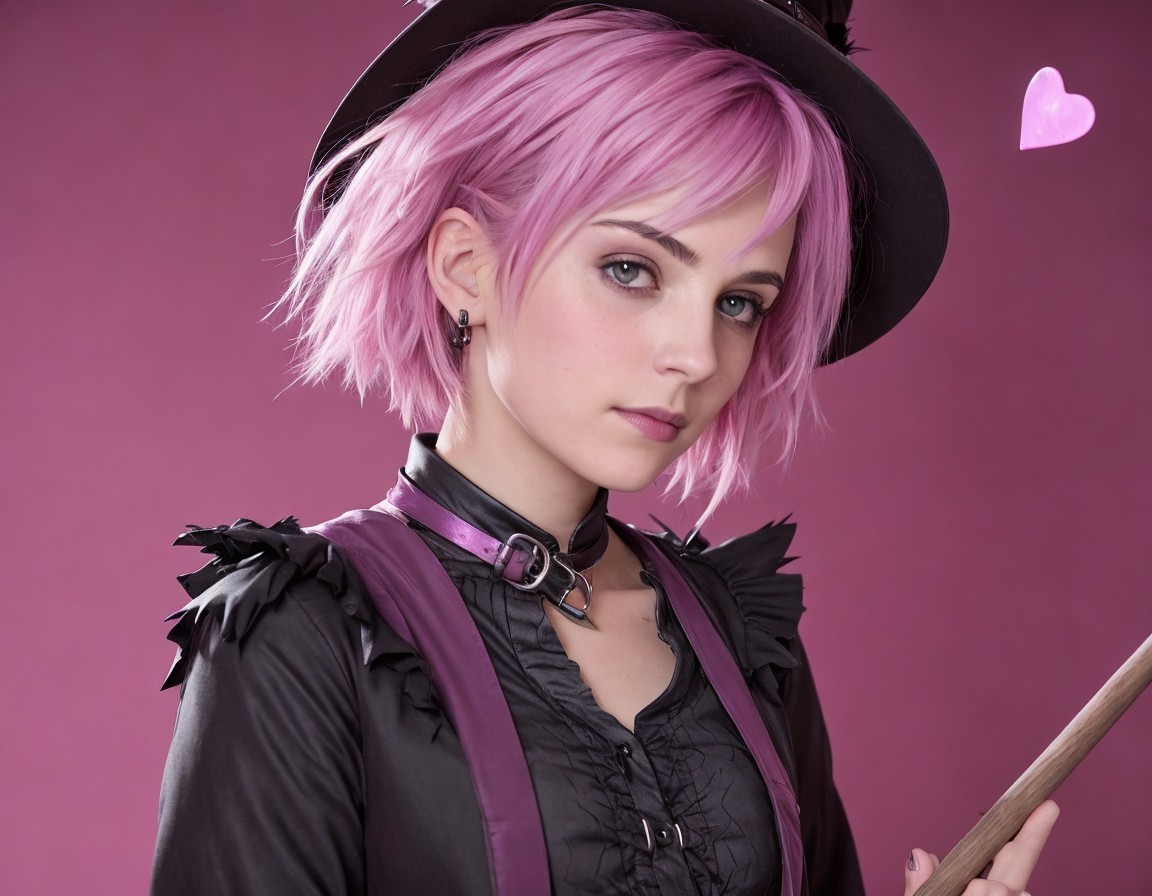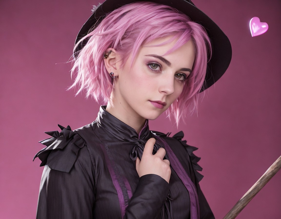 Prompt: "Tonks was a young witch with a pale heart-shaped face and dark twinkling eyes. She typically kept her hair short and spiky, and often bubblegum-pink."