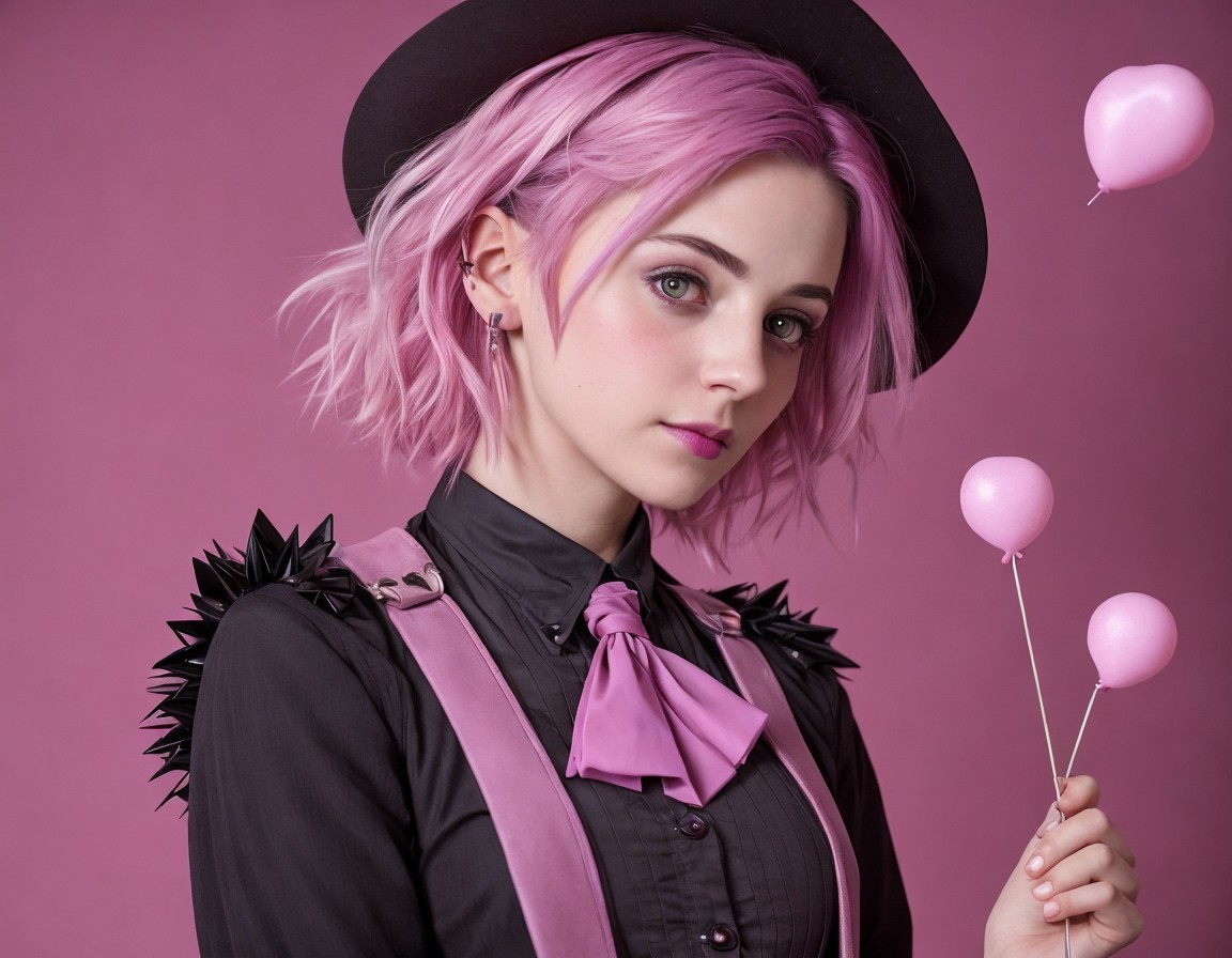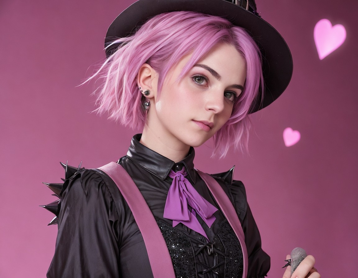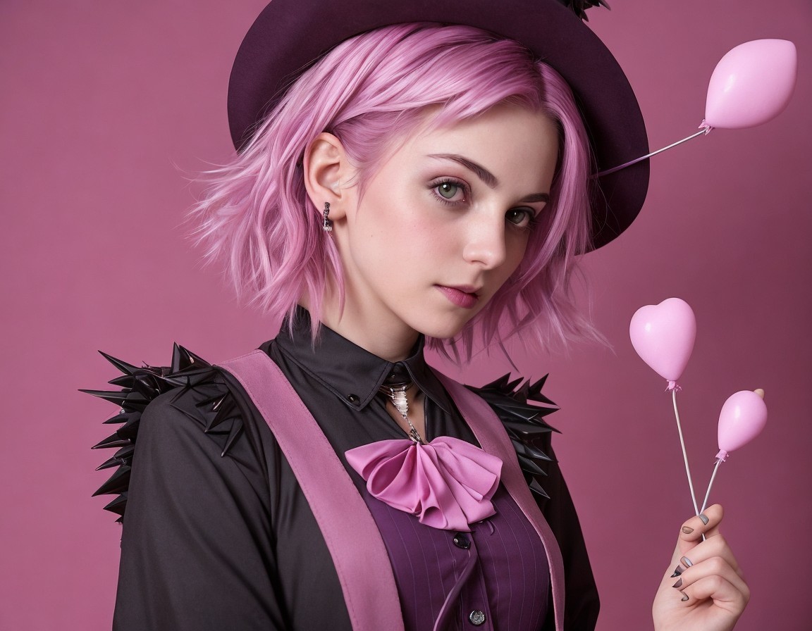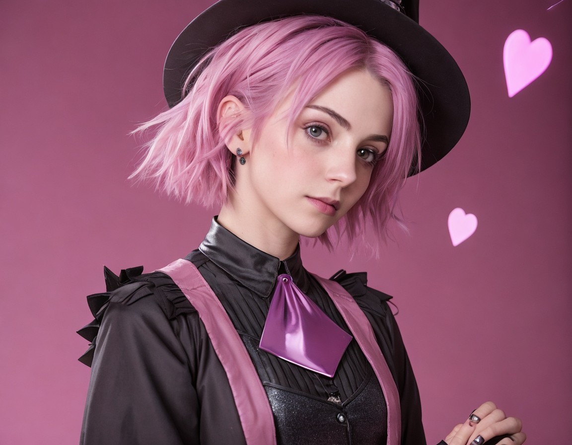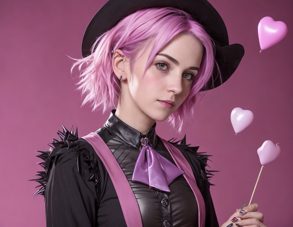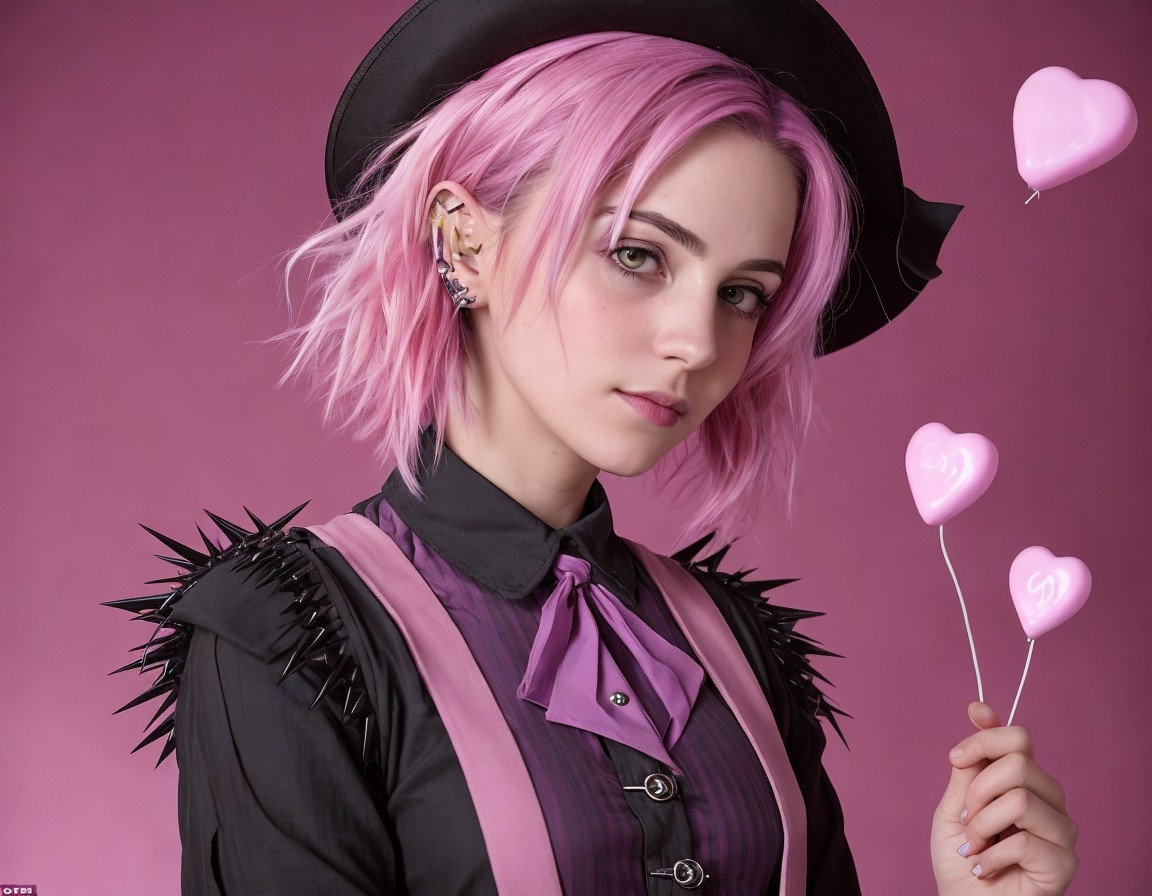 Prompt: "Tonks was a young witch with a pale heart-shaped face and dark twinkling eyes. She typically kept her hair short and spiky, and often bubblegum-pink."