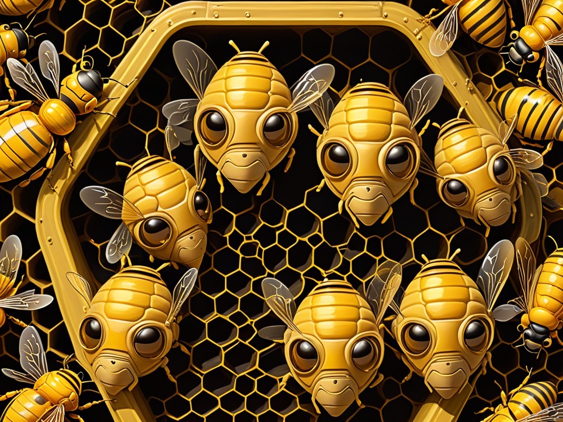 Whimsical Illustration of Bees in Honeycomb Structure