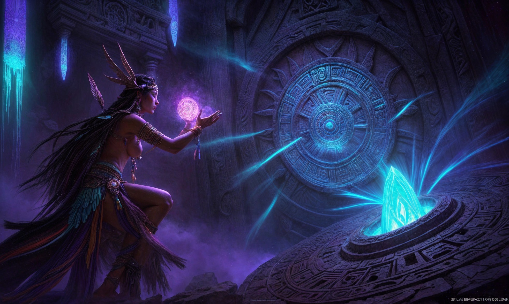 A mystical scene features a figure in traditional attire, holding a glowing orb before an ancient stone portal adorned with intricate designs and a face, surrounded by a dark, ethereal atmosphere.