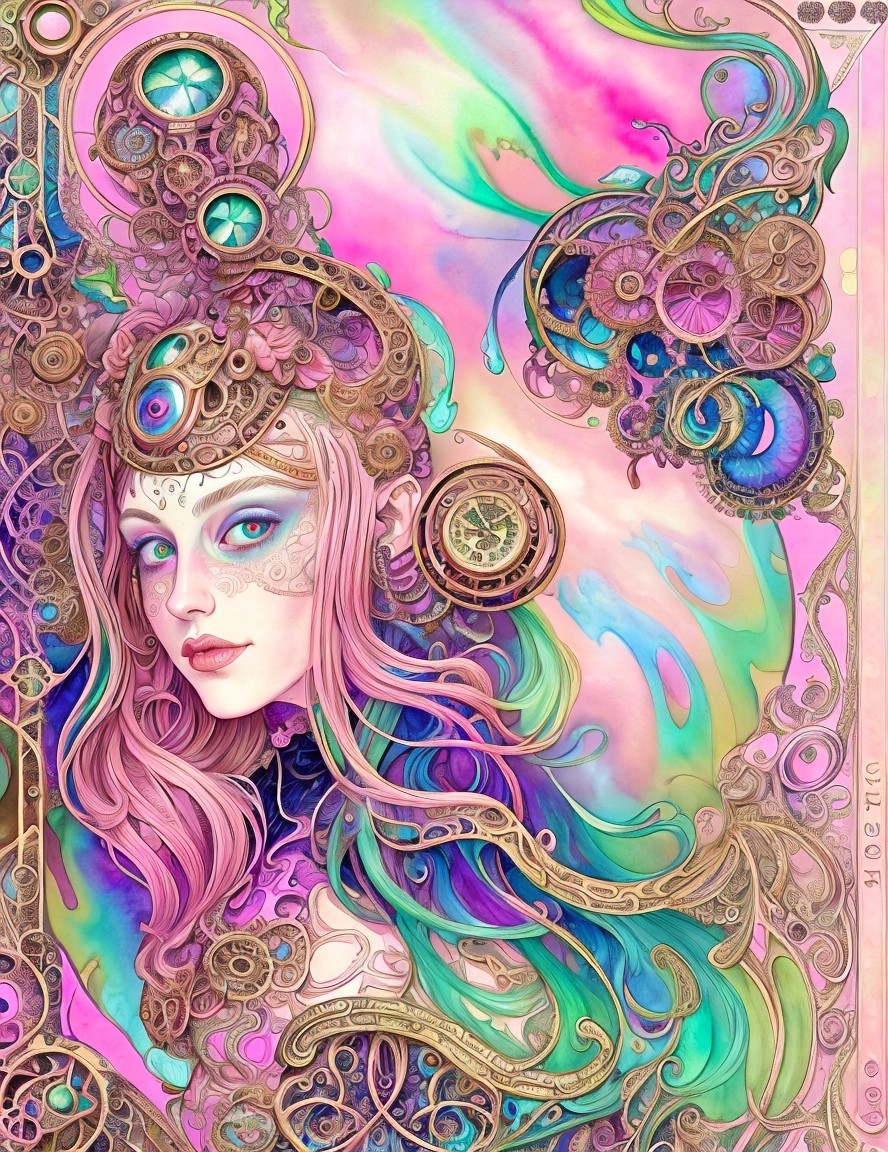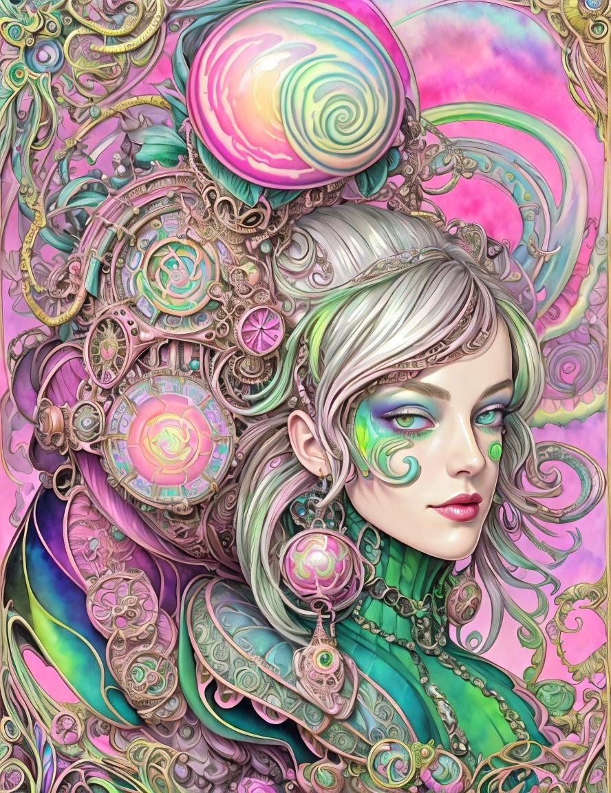 + Prompt:Watercolor portrait, maximalism, biomorphic details, steampunk, female face, intricate victorian ornate, small strokes, shiny gothic surrounding, tints of 1980s fantasy art, highly detailed, luminous iridescence, triadic color scheme pink green beige, vector 8:3, psychedelic psychpomp scene with tints of Dee Nickerson