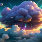 A surreal sky filled with vibrant, fluffy orange flowers floats among dark clouds, with beams of sunlight streaming down and droplets cascading from the blossoms, creating a dreamlike atmosphere.