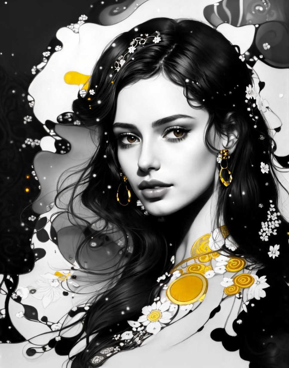 + Prompt:Beautiful woman with soft features and a klimt inspired dress, in front of a wall in the Klimt style, with a cup of tea, looking into the camera, grunge tea leaves in the style of Klimt