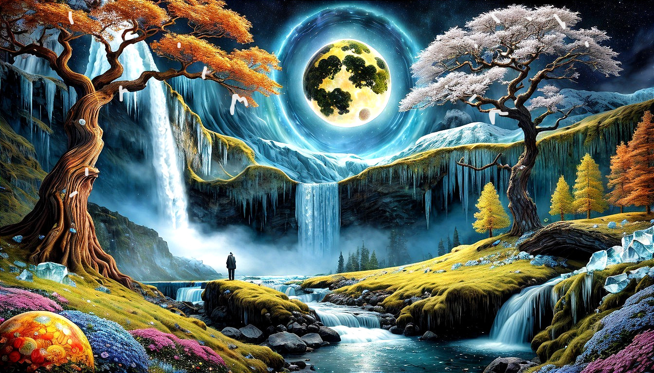 landscape under cosmic sky, waterfalls, ice, giant trees with some snow on them, fullmoon, ice hanging from trees, SURREALIST EYE-ORB DETAILS, flowers by Tomasz Alen Kopera, Dariusz Zawadzki, Gustav Klimt and Picasso.