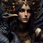 A woman adorned with a majestic feathered headdress and intricate jewelry gazes intensely. Beside her, a striking black crow adds an element of mystique to the captivating, dark composition.
