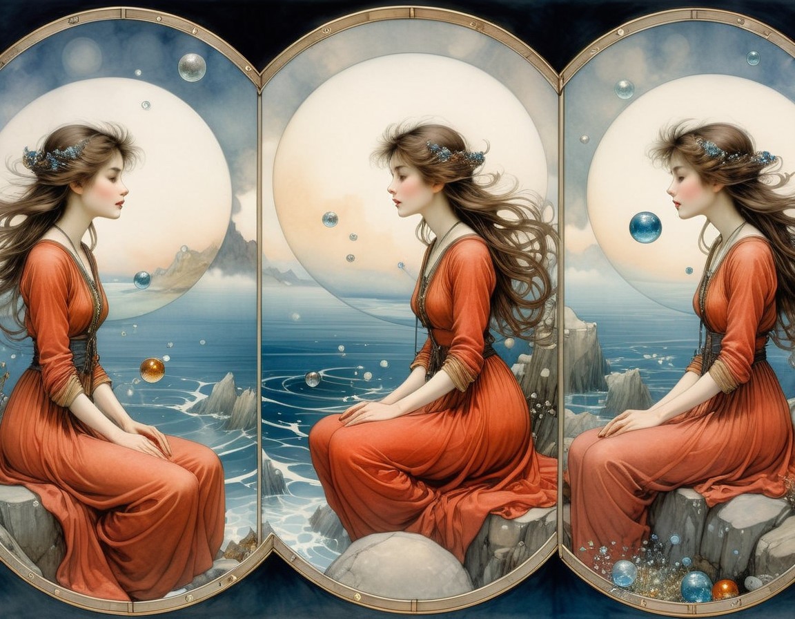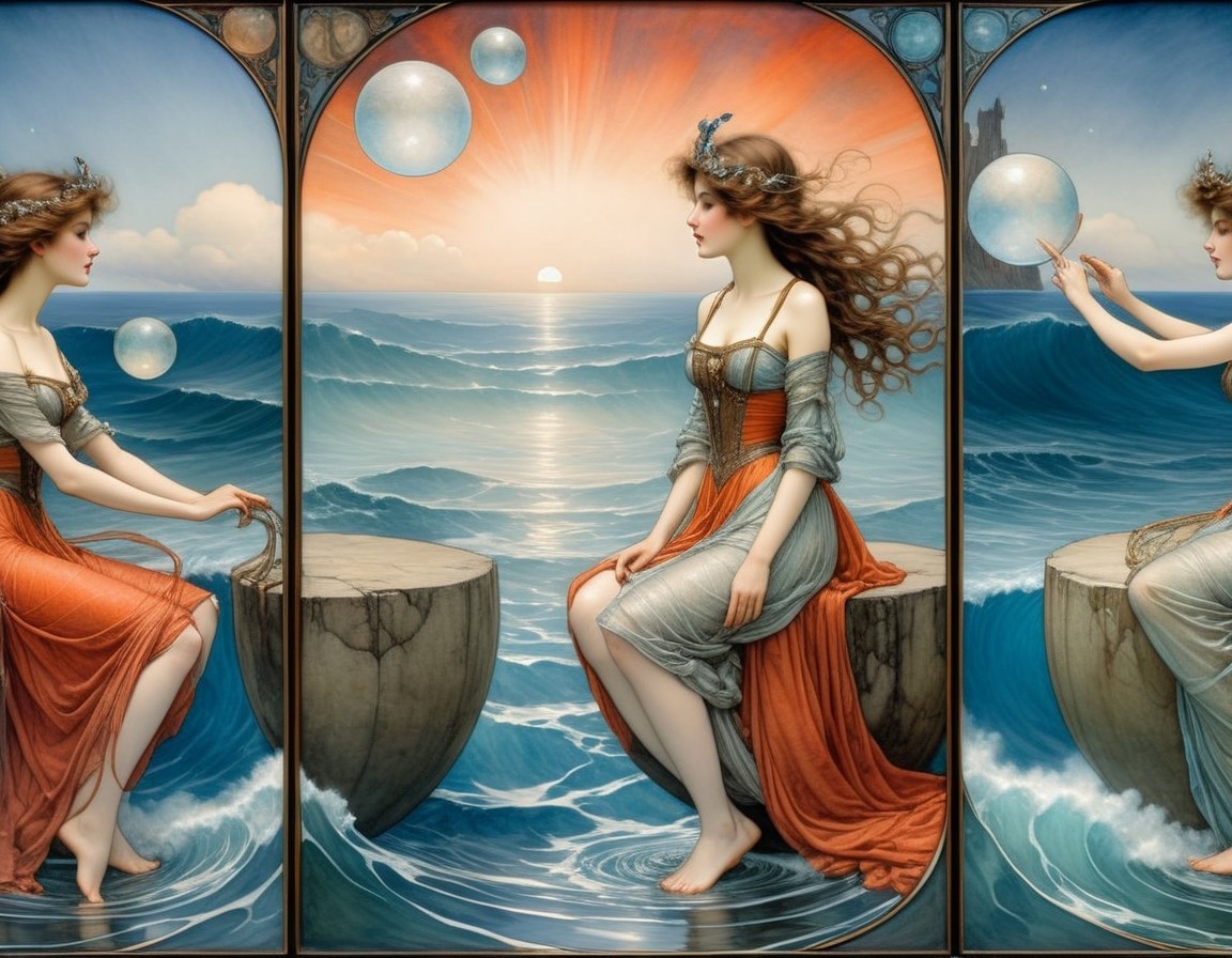 A serene, ethereal woman sits on a globe, surrounded by ocean waves. Her flowing hair and elegant attire contrast with the vibrant skies and celestial bodies in the background.