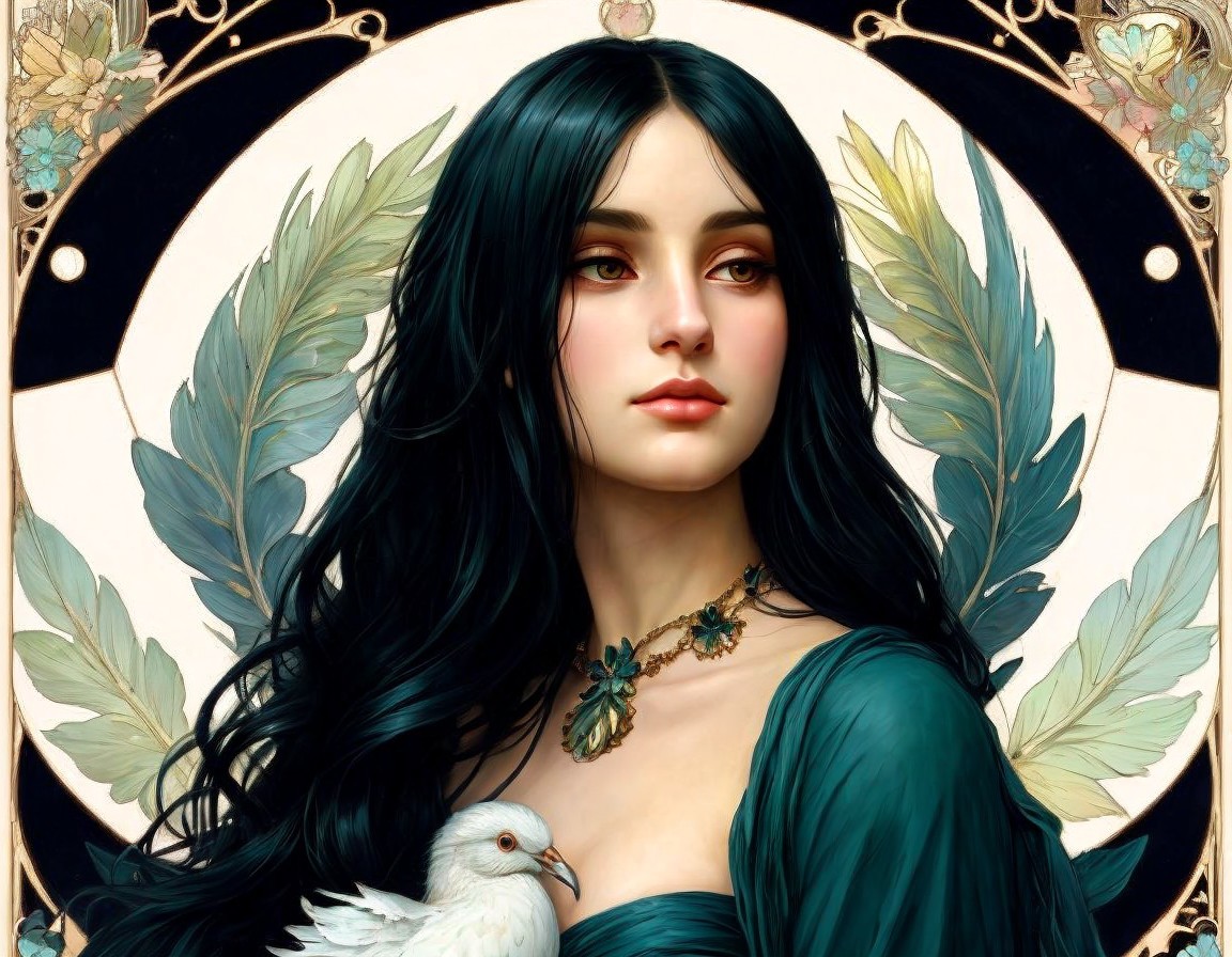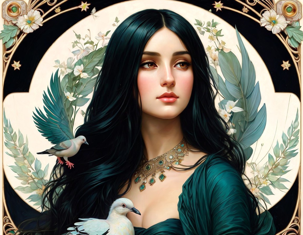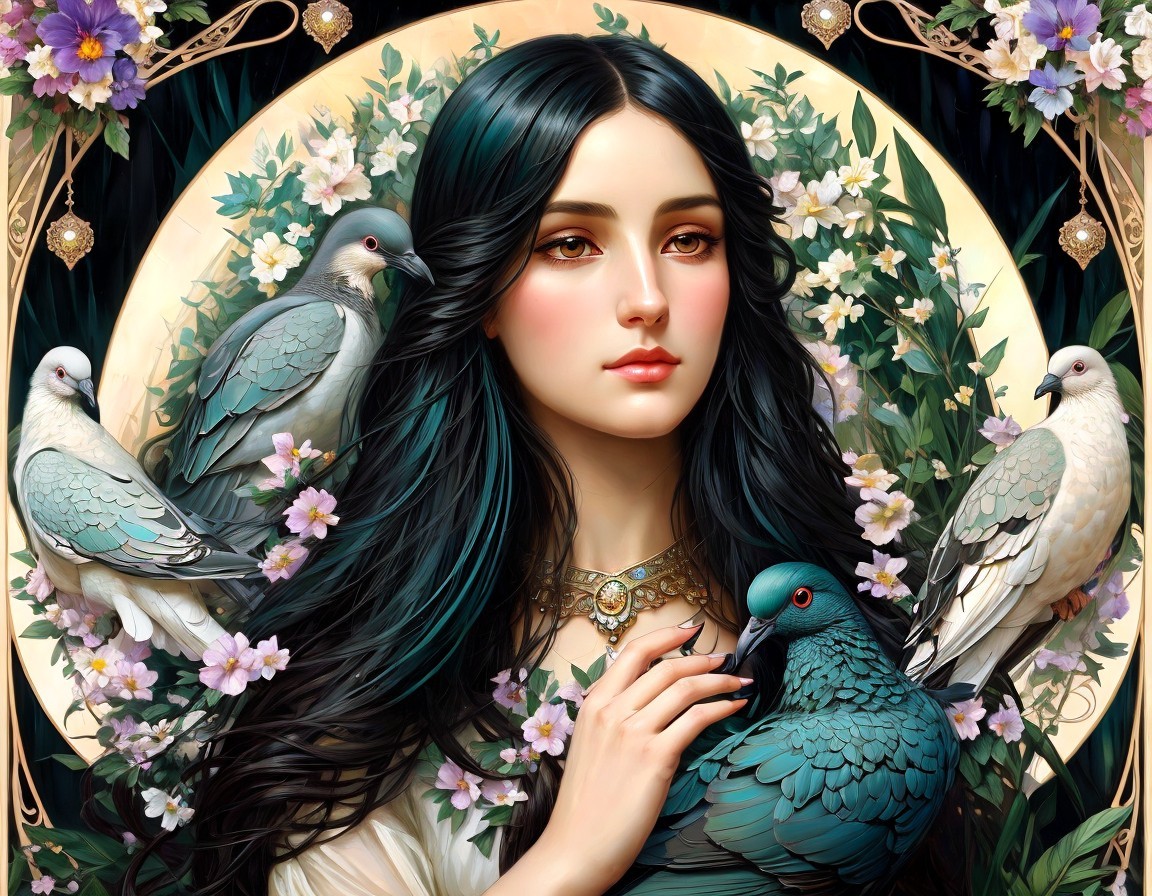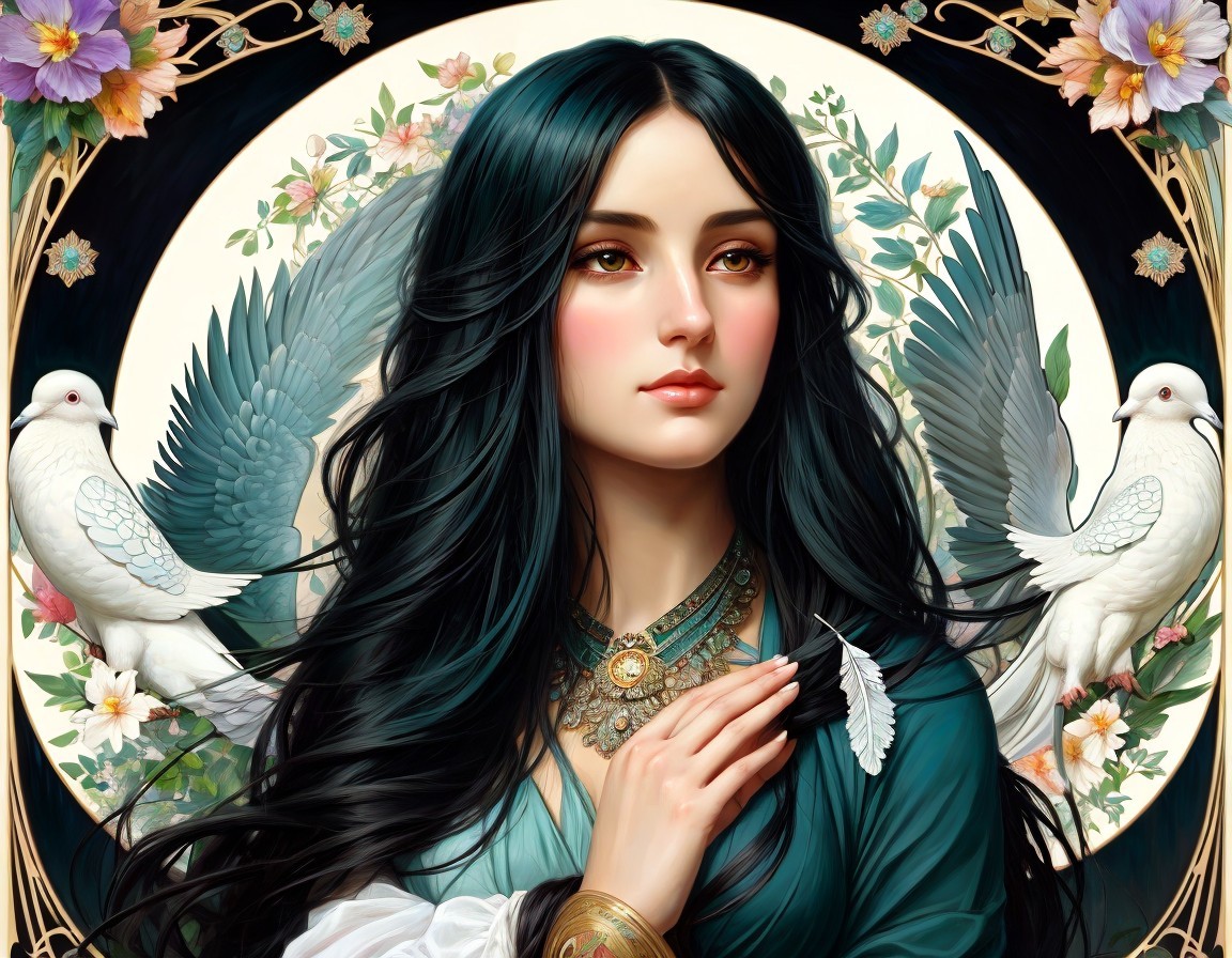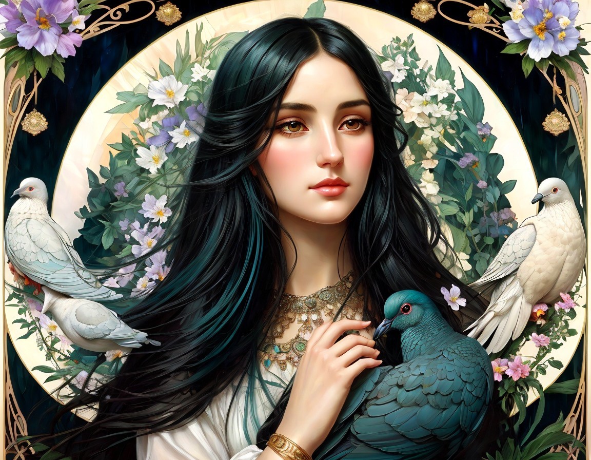 Detailed Illustration: Woman with Black Hair, Flowers, Doves in Golden Circle
