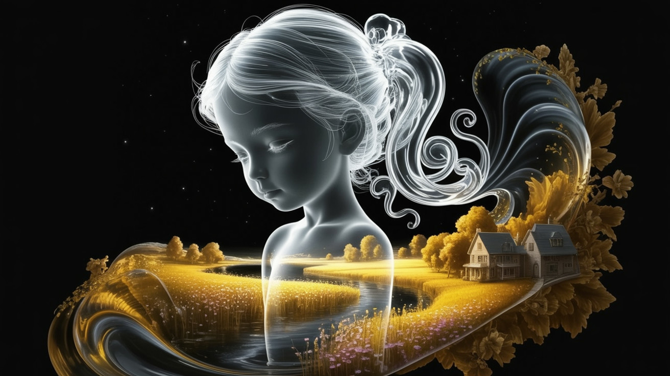 A delicate glass sculpture portrays a serene girl with flowing hair, nestled in a vibrant landscape filled with flowers, trees, and miniature houses, blending nature and artistry beautifully.