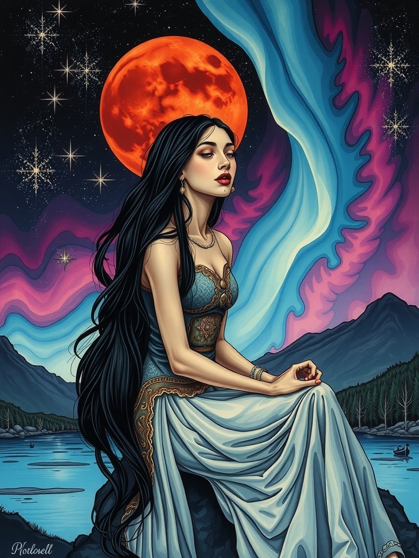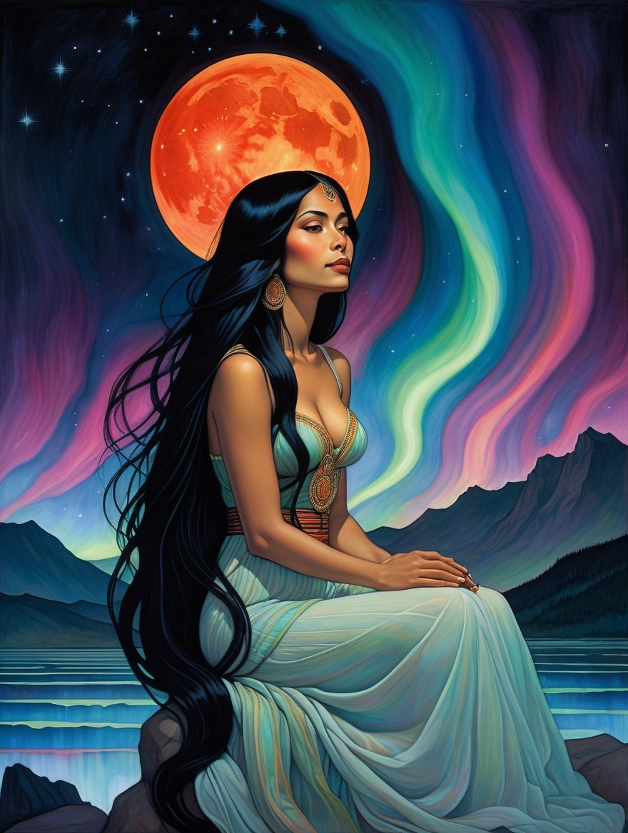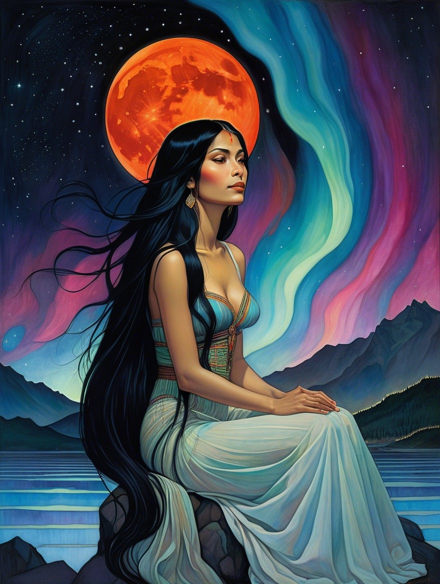 Prompt: "Chimaltenango Guatemalan woman with Long black Hair, sitting under the northern lights, starfire, Style: Möbius, Daniel Merriam, Egon Schiele, Alphonse Mucha, Anna Dittman, illustration"