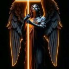 A striking figure with large, glowing wings stands confidently, holding a shimmering sword. The dramatic lighting enhances the fierce and powerful aura, creating an ethereal, heroic atmosphere.
