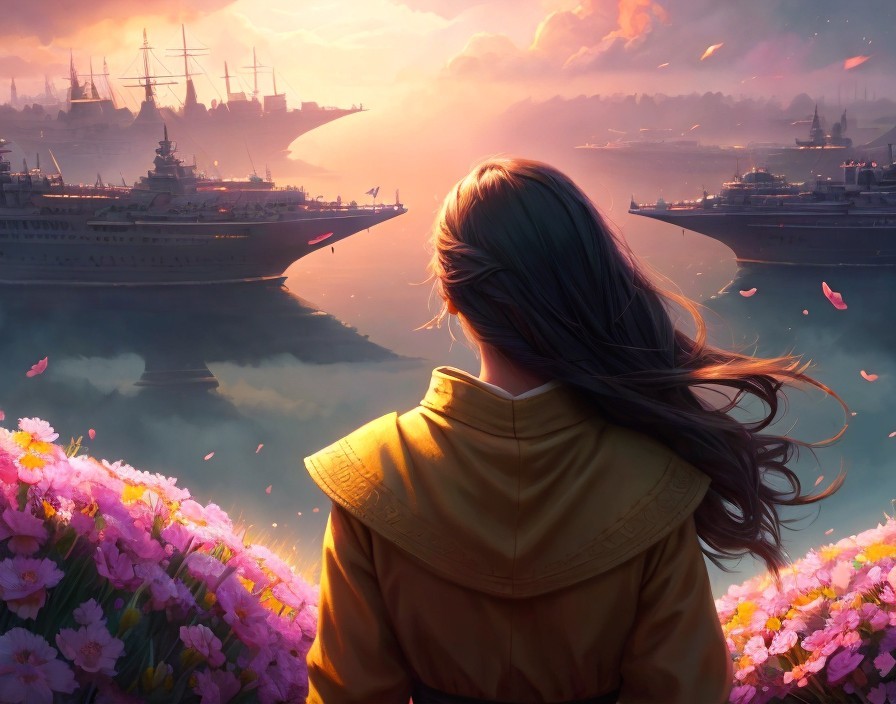 Woman in Yellow Jacket Overlooks Futuristic Cityscape