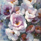 A vibrant painting of blooming flowers in shades of white, purple, and red, with golden accents and a soft, colorful background, creating a lively and cheerful atmosphere.