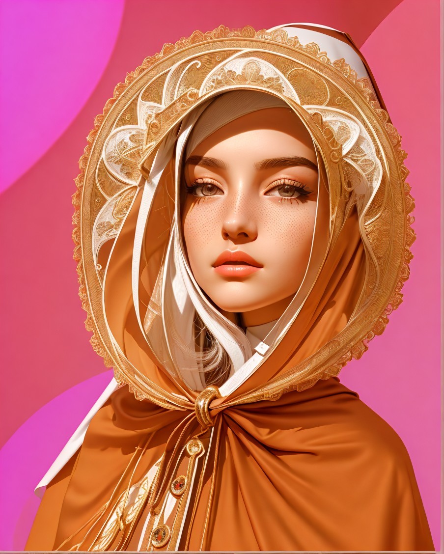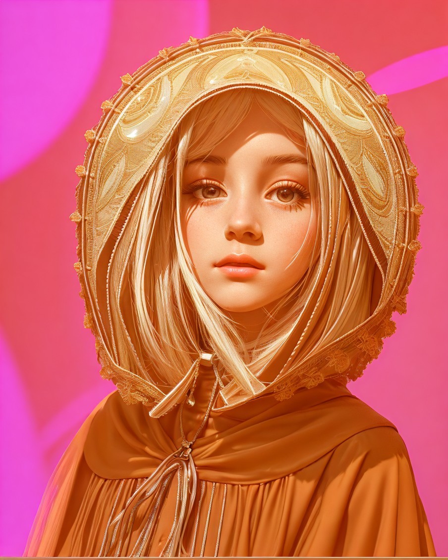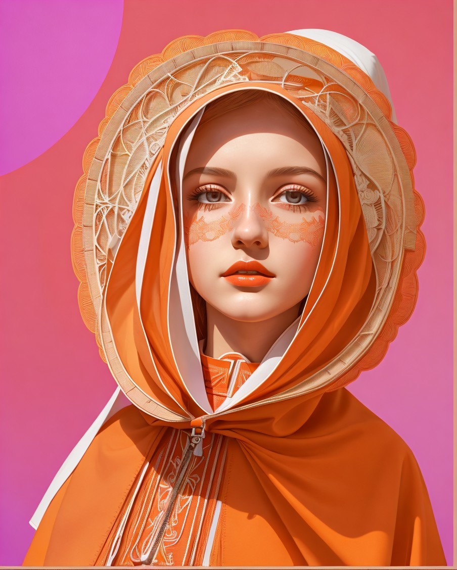 Prompt: Stylized portraiture, very stylized illustration, teenage woman in a orange nun's habit under a halo, Stylised striped clothing, against a pink background, mystical, unique character, surreal atmosphere, fusion of 2D flat styles, ultra-realistic details, hyperrealism, detailed and high-definition, depth of field, texture painting, dynamic lighting, symmetrical design, crisp quality, abstract illustration, urban, style of Catrin Welz Stein and Charles Rennie Mackintosh, Dynamic color palette, delicate complimentary colors, Vibrant orange and pink color palette, fine strokes, graphic, scribbles and lines and strokes, attractive, beautiful, 3D effects 1.8, ambient occlusion 1.5, shadow mapping 1.3, wavery texture patchwork 1.8, raytraced shadows 1.8, sublime, cottagegore 1.9, crisp quality ,very cute scrap art by Jackson Pollock and Margaret Keane, american gothic 1.7, dynamic lighting 1.7, gouache details, plushy psychpomp scene, triadic color scheme pink orange lilac, Pastel colors of beige and orange, delicate coloring 1.9, tints of anime fantasy art, highly chipped, chipped, spiritual, golden ratio, plasticity 1.6, brightness 1.4, silver particles, devilish red eyes, gothical art 1.3, saturated colors 1.5, tints of surrealism, brightness 1.4