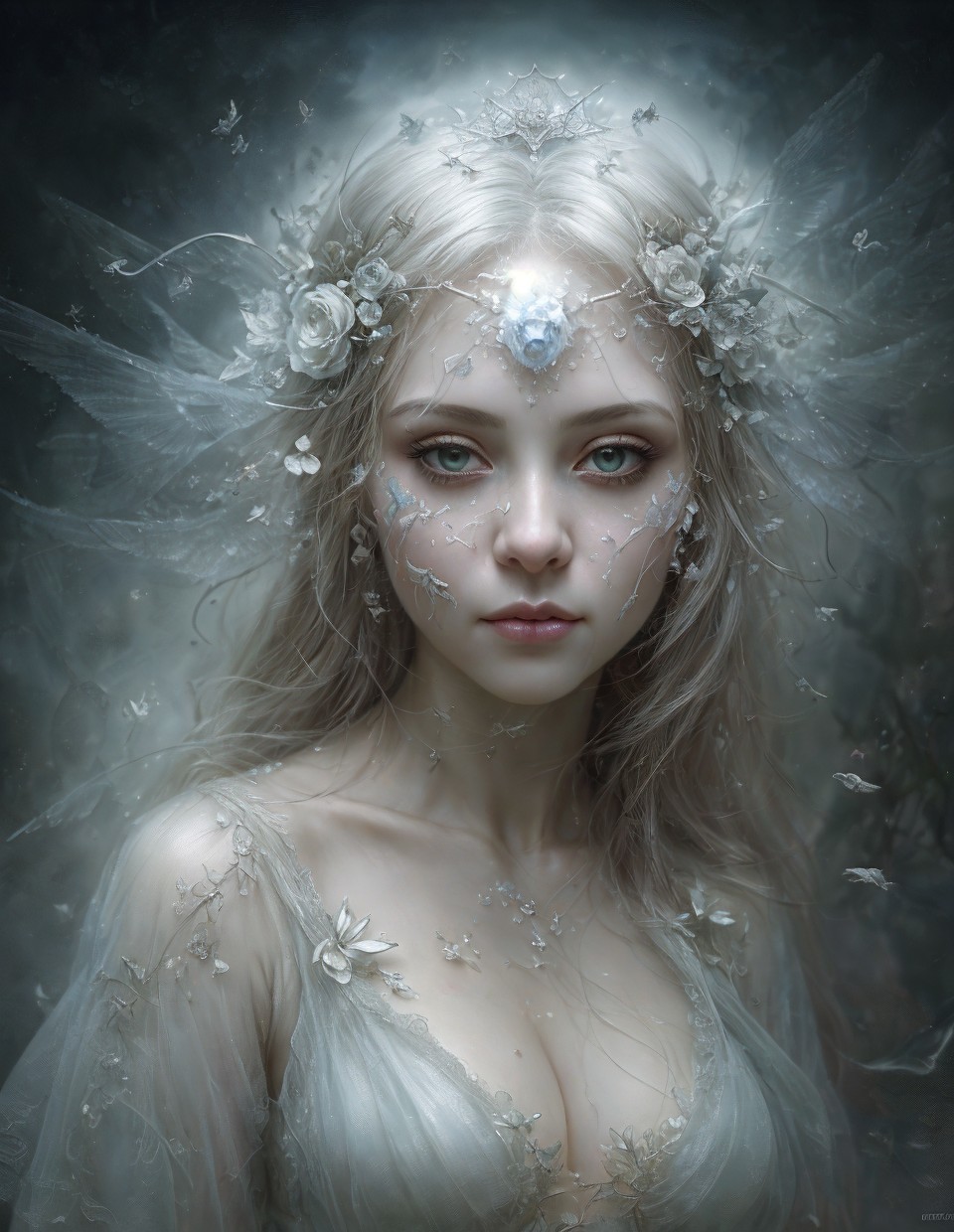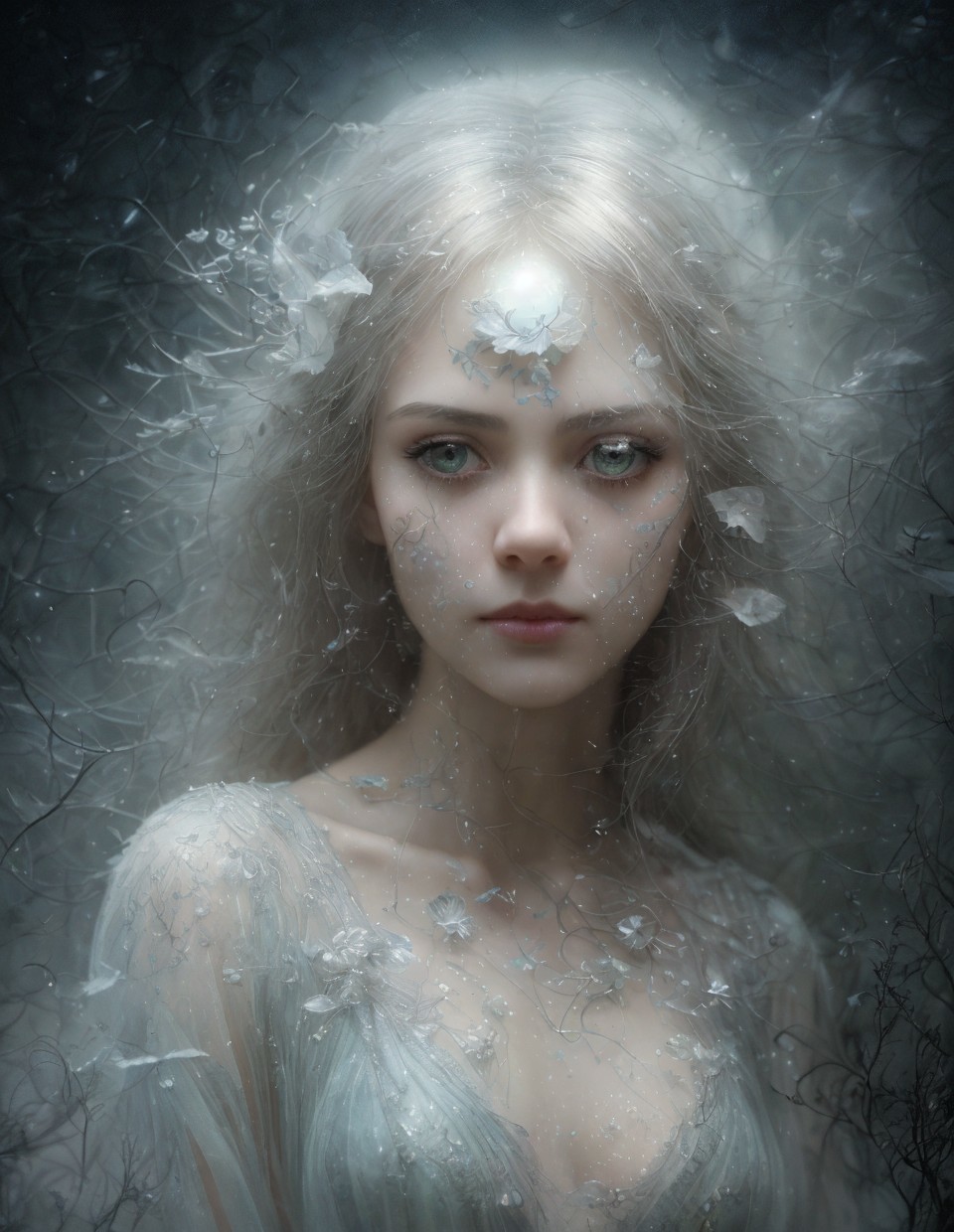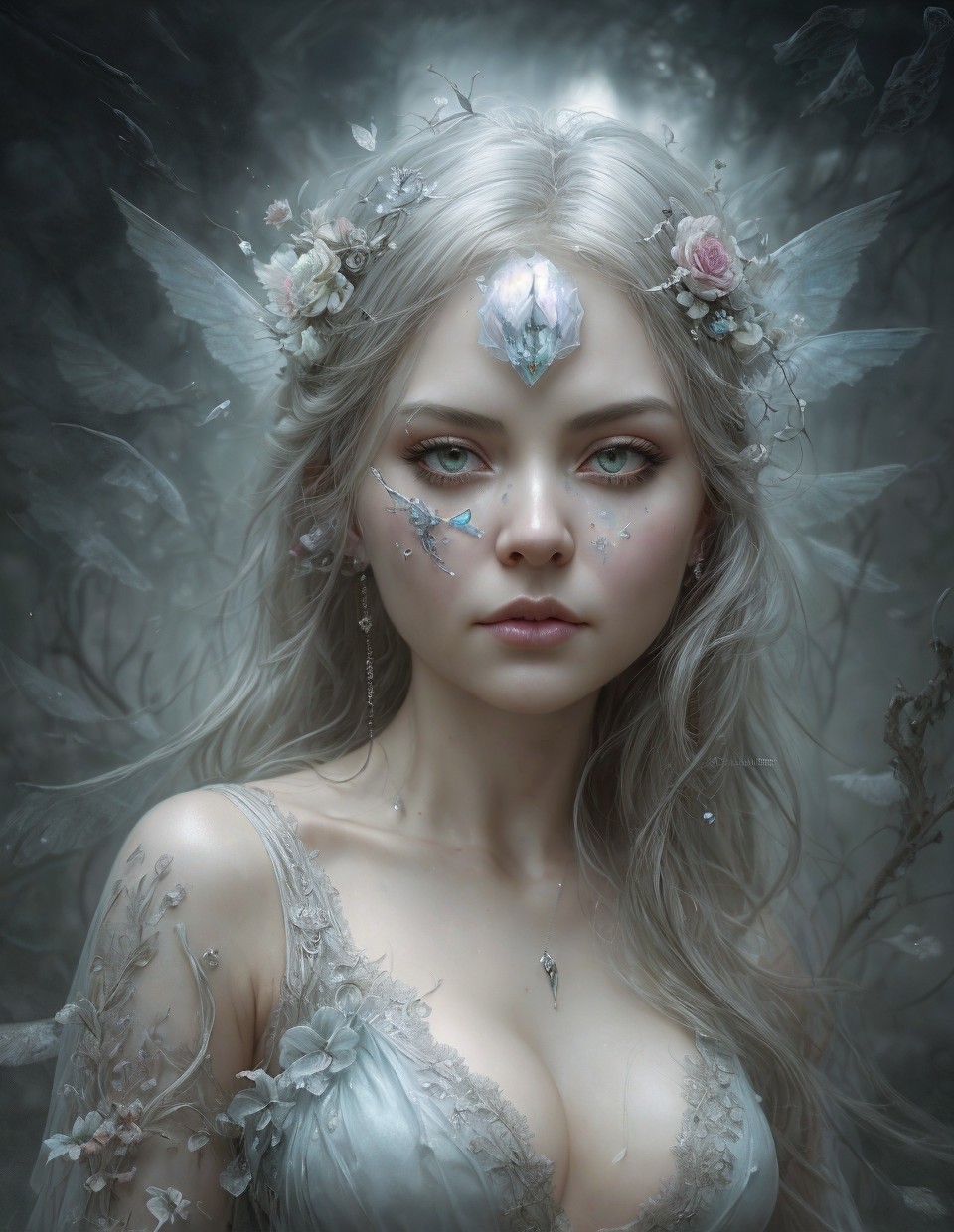 Portrait of ethereal woman with pale skin, silver hair, crystal tears, and floral adornments.
