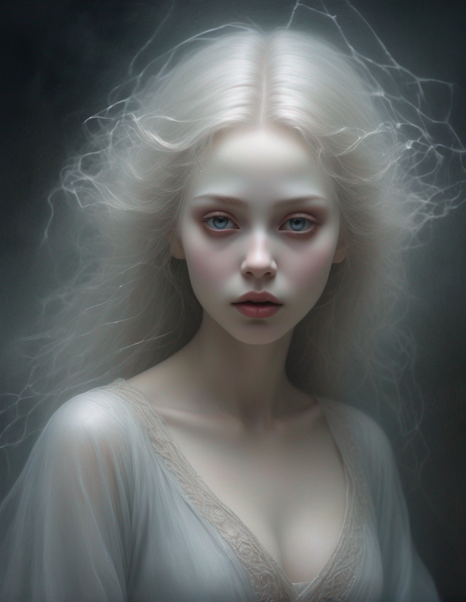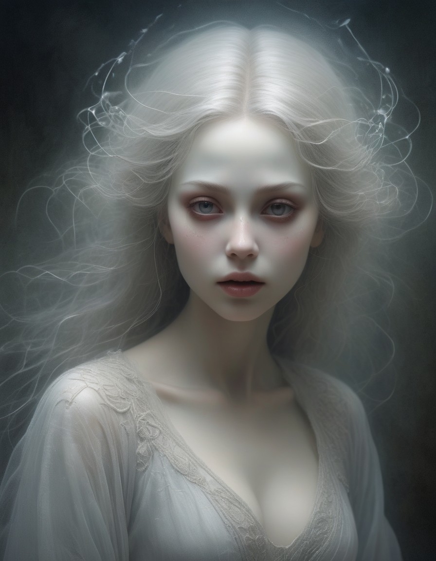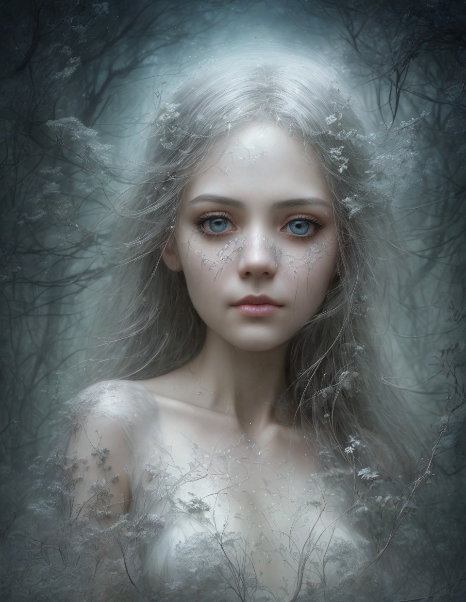 Portrait of ethereal woman with pale skin, silver hair, crystal tears, and floral adornments.