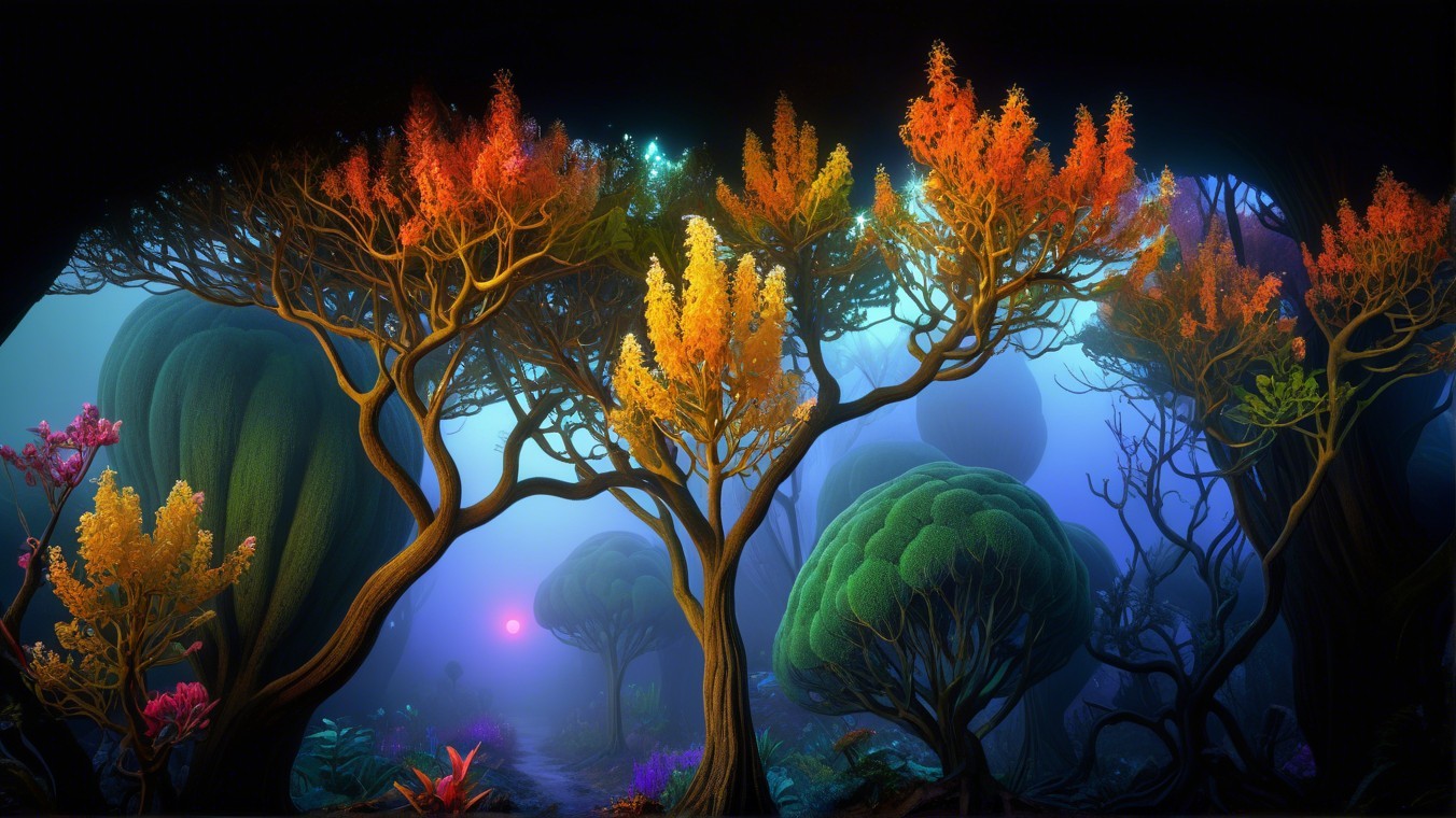 A surreal, enchanting scene features whimsical trees with glowing, fiery branches. A figure stands in awe amidst vibrant foliage and a mystical atmosphere, evoking a sense of wonder and exploration.