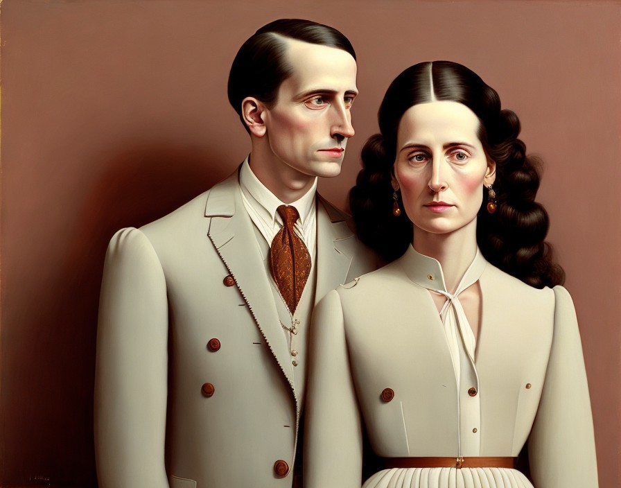 A stylized portrait of a man and woman with vintage hairstyles, dressed in formal beige attire, exuding elegance and poise.