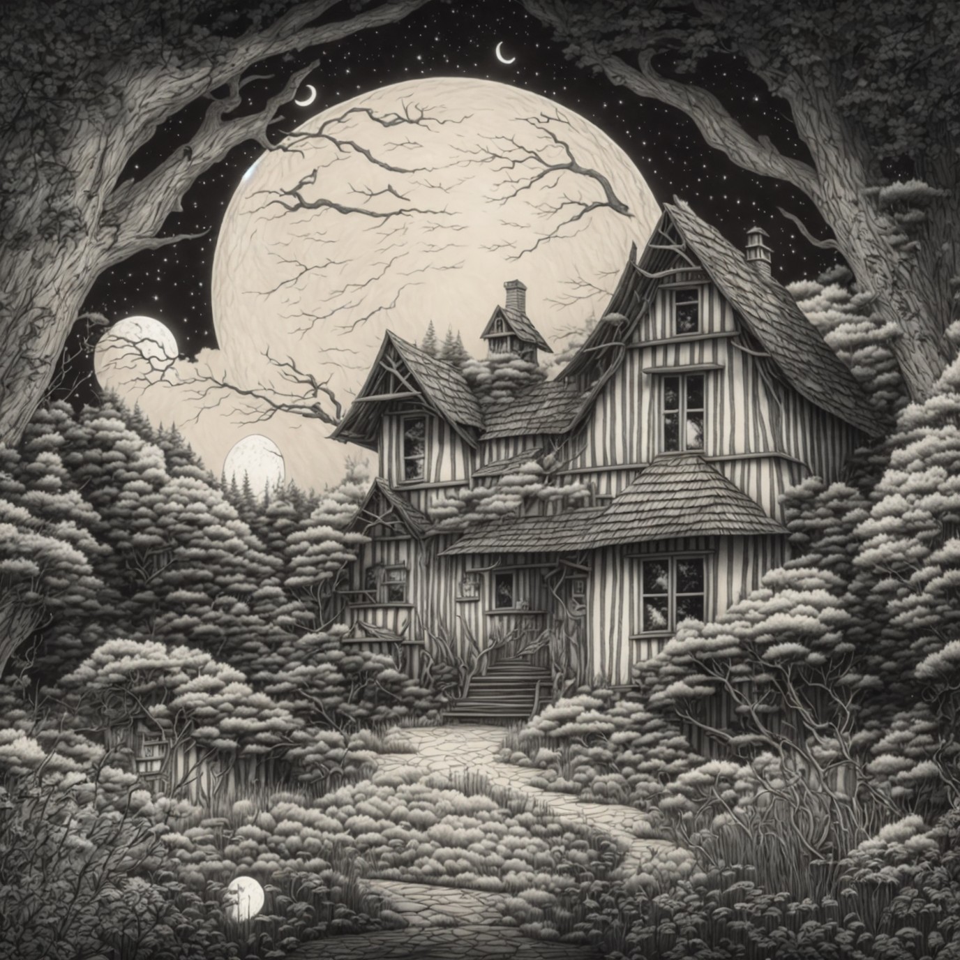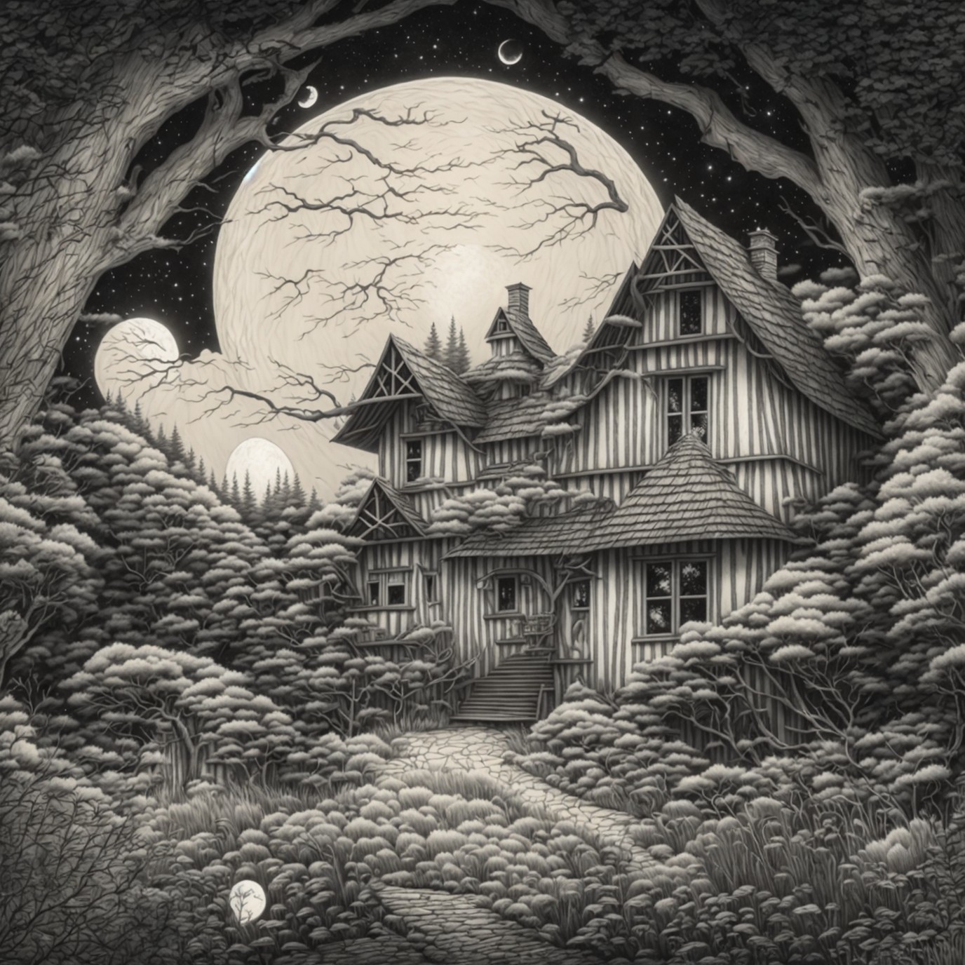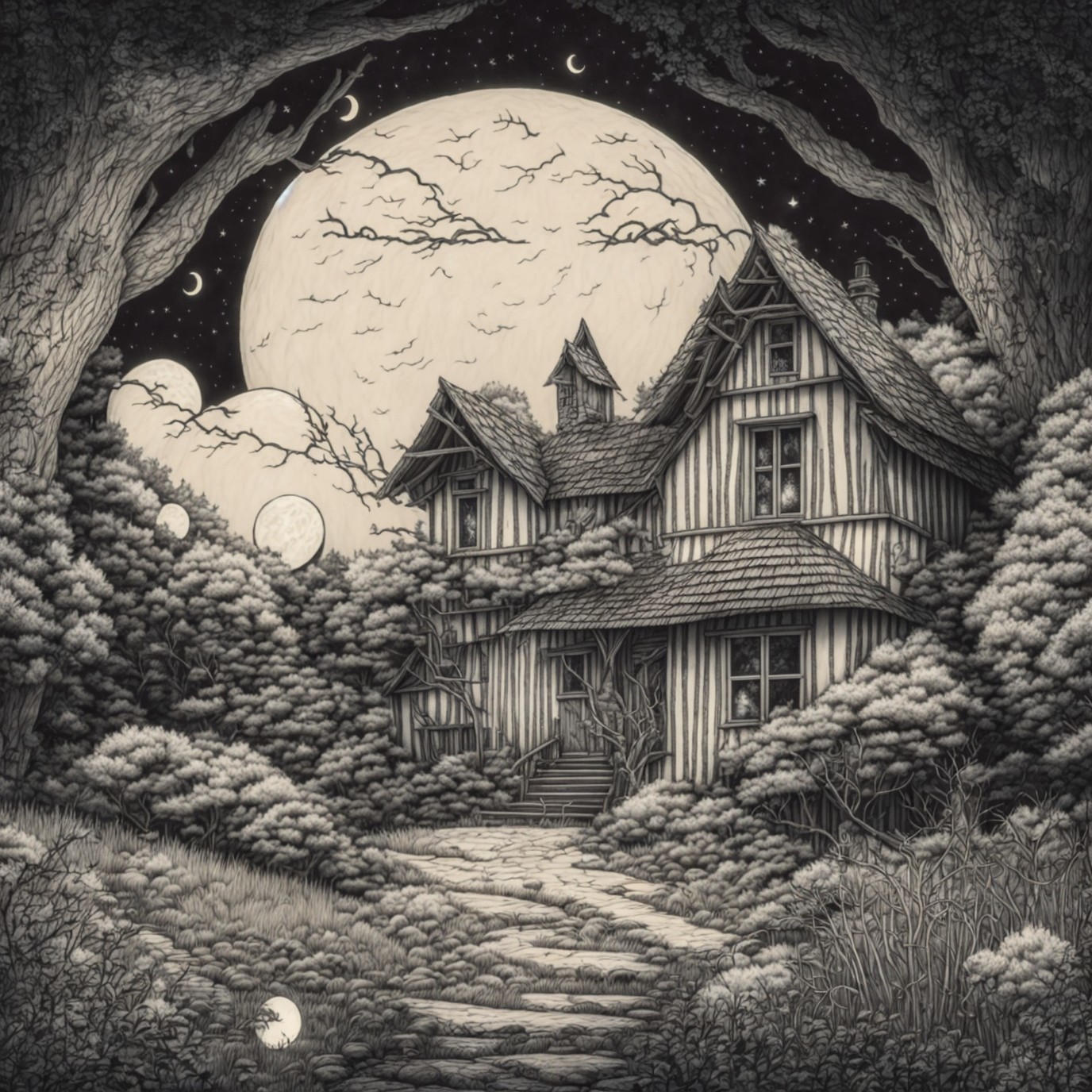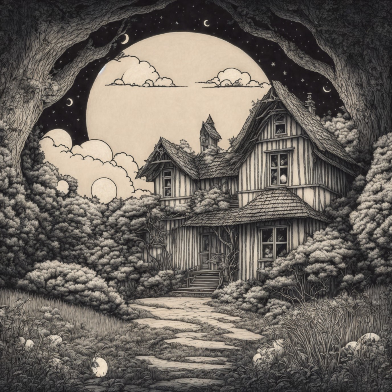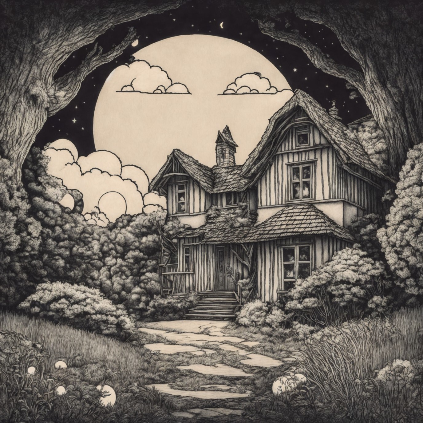 Prompt: pen drawing of a house in the woods with a full moon in the background and clouds in the sky, black and white, ink lines, pen line drawing, curved lines, curved strokes, monochrome, storybook illustration, simple strokes, simple geometry, child's drawing, magical, desaturated, vintage, stained, Cute and adorable cartoon, fantasy, dreamlike, surrealism, super cute, adorible, minimalist, low polygon, 2D cartoon of in the style of art from A.J Carson, Angela Barrett, Arthur Rackham, Aubrey Beardsley and Becky Cloonan, full moon, grass, house, moon, night, no humans, sky, traditional media, oak tree