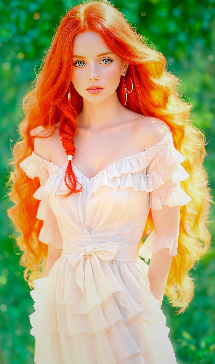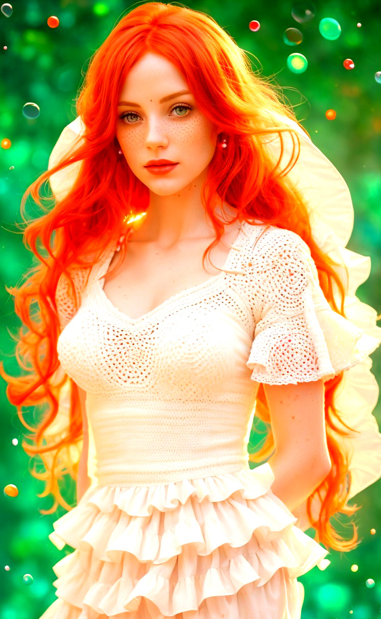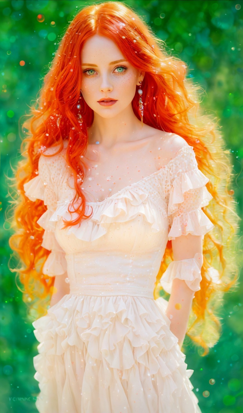 Body portraiture,  red haired woman in white  crinoline dress made of calico material,  crochets, contraptions, realistic devilish eyes, dynamic lighting 1.7, watery alcoholic painture and ink, dots and flares and splashes, soft edges, back-lit, triadic color scheme orange beige red, bright lighting, brushed paint, style of paint dripping technique, hues, chiaroscuro lighting, ambient occlusion 1.5, , 3d effects 1.8, intricate stylized hairstyle, brightness 1.7, stylized zentangle lines, abstract, coherent, hues, eerie, occult, retropunk, sweaty, , occult, Anglocore 1.9, auracore, high coloring 1.9, mosscore 1.7, cottagegore 1.9, silver particles, dreamy glow, tints of abstract art nouveau illustration, tints of  Pop art and Surrealism, ethereal, otherworldly, abstract style 1.7, hues, grain, blurry aura, fantasy movie still, synthetic essence, raytraced shadows,