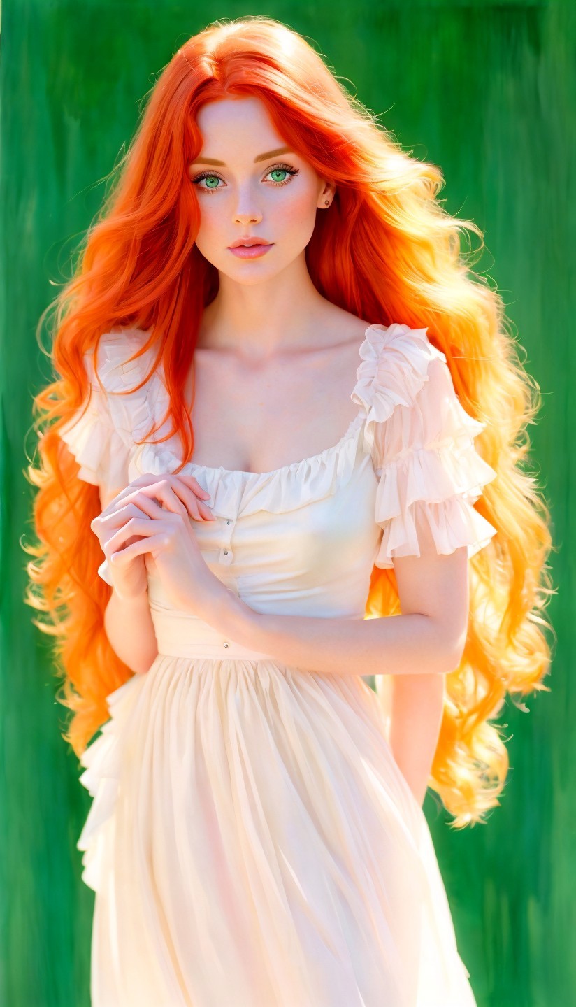 Body portraiture,  red haired woman in green crinoline dress, calico, captured with a 90 mm lens, featuring photorealistic high resolution skin ,  style of Margaret Keane, sharp focus, hyper-detailed texture, vibrant colors,  very detailed watercolor and ink painting, beautiful composition,  tints of 1970s advertising art,