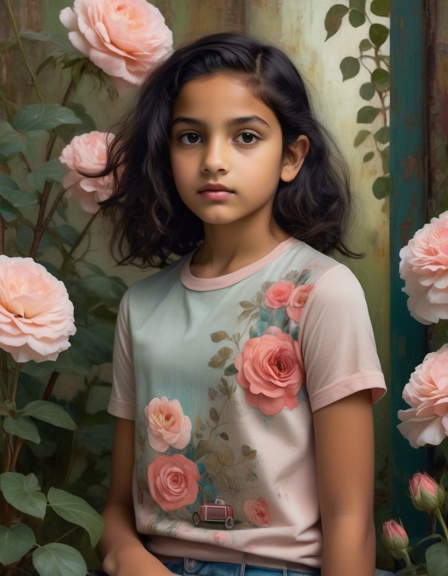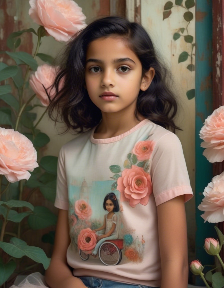 influenced by Klimt, Flora Bowley, Lovely young Indian girl's face, 7 years old, A highly detailed, realistic surreal image of a young girl, sitting on an old rusted 1950's red radio flyer tricycle in an empty abandoned white room with flaking pale walls. She wears a faded pale coral tutu, undershirt, tights, and pale ballet slippers. The Eiffel Tower is faintly visible through a distant window, creating a striking juxtaposition. The artwork utilizes pointillism techniques in pale grey turquoise, moss green, red, orange, black, white, sienna, and burnt umber, reminiscent of Georges Seurat.