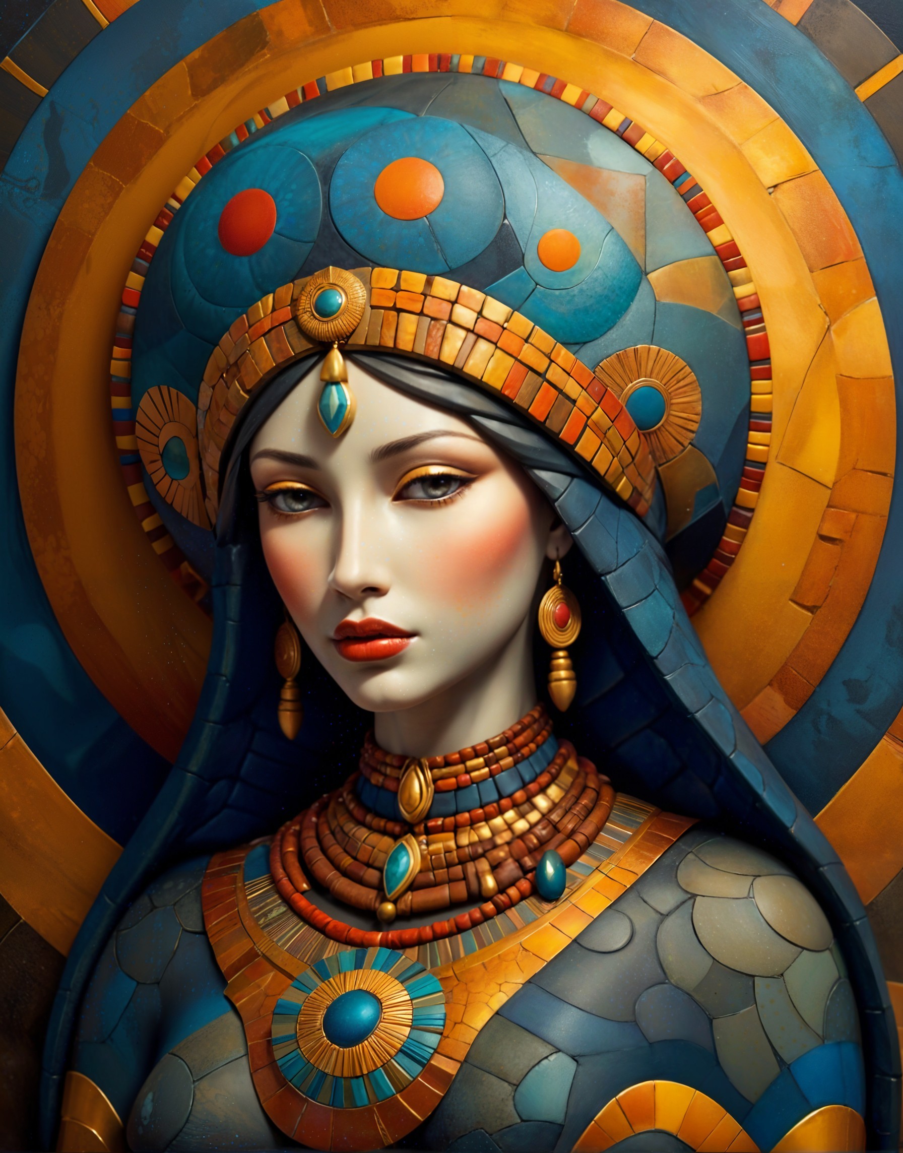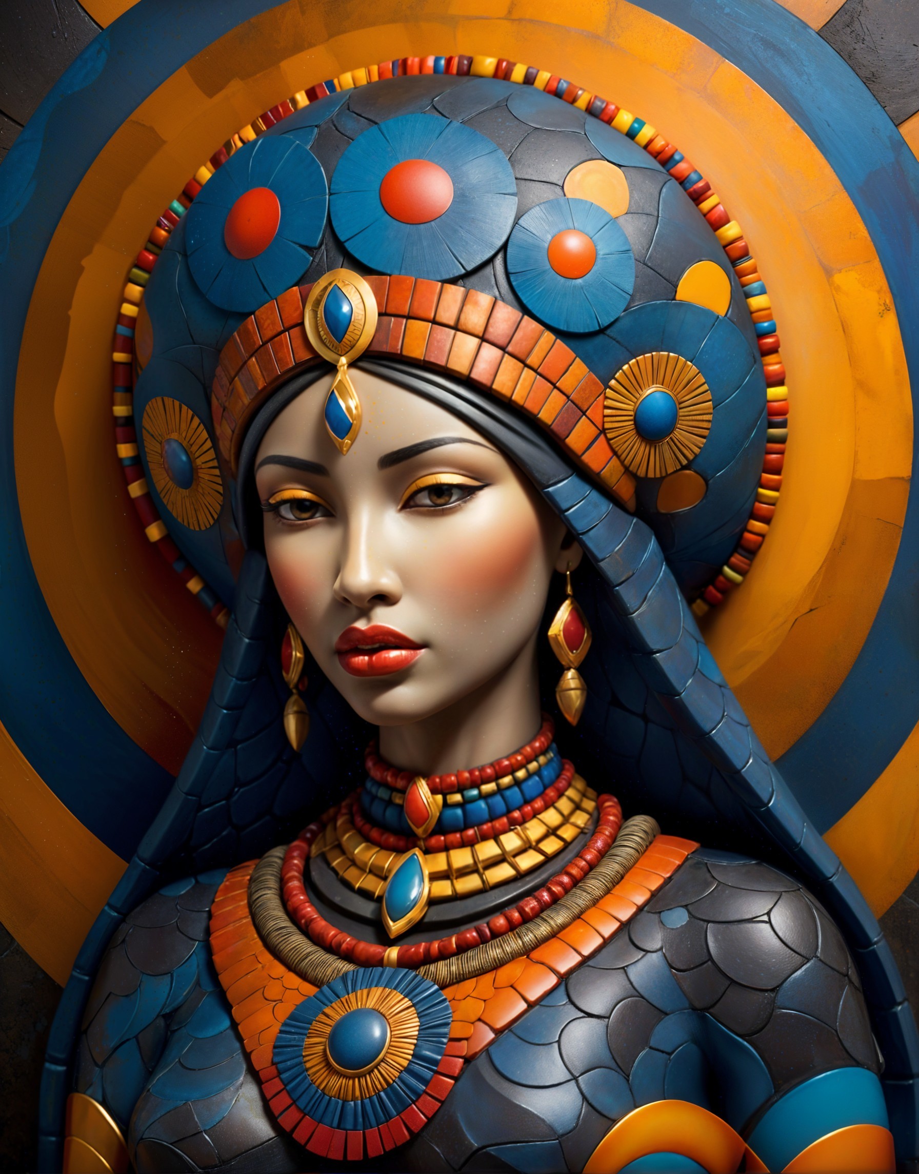 The image depicts a beautifully crafted figure adorned in vibrant blue and orange, featuring intricate jewelry and an elaborate headpiece, exuding elegance and cultural richness.