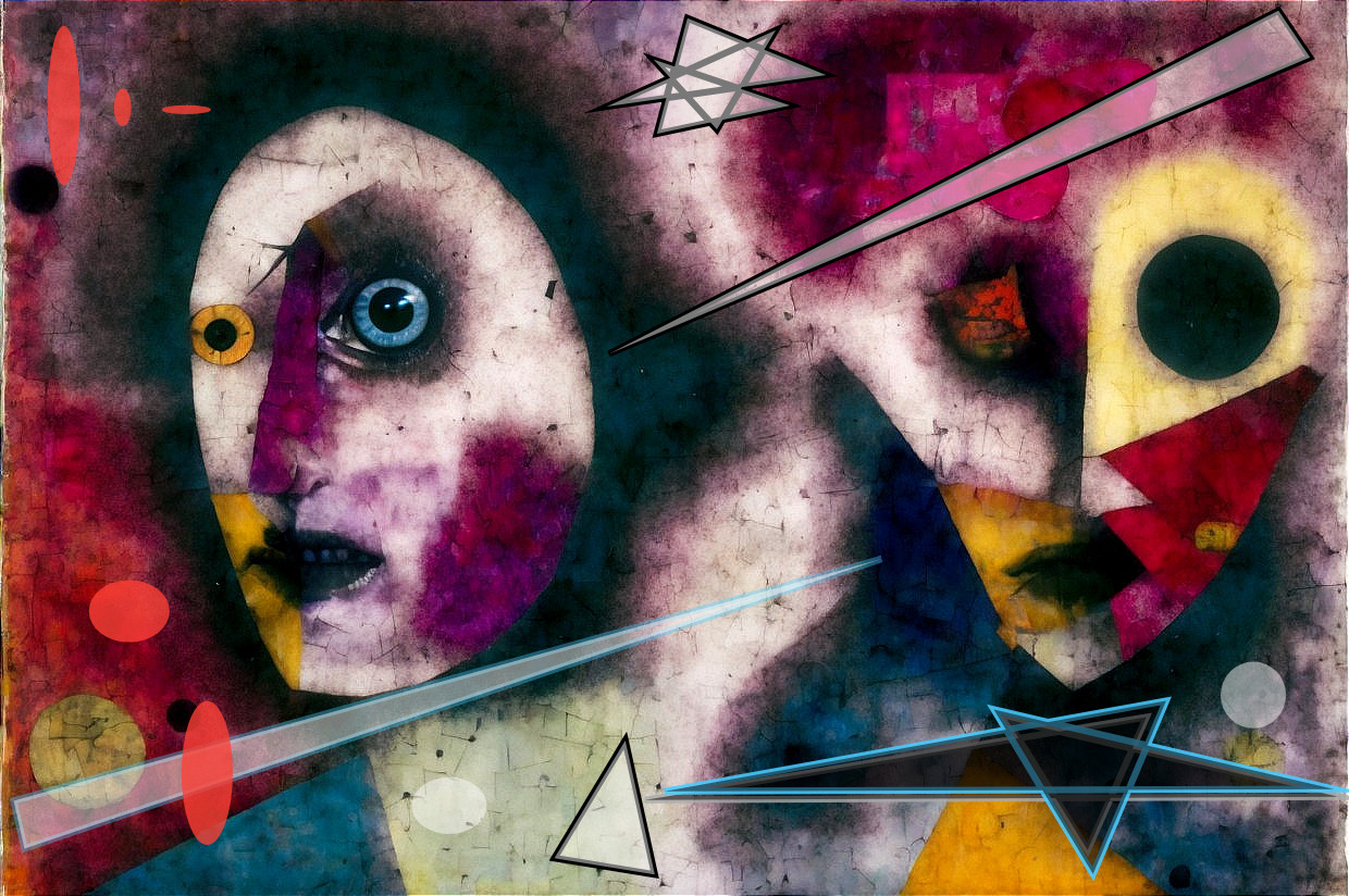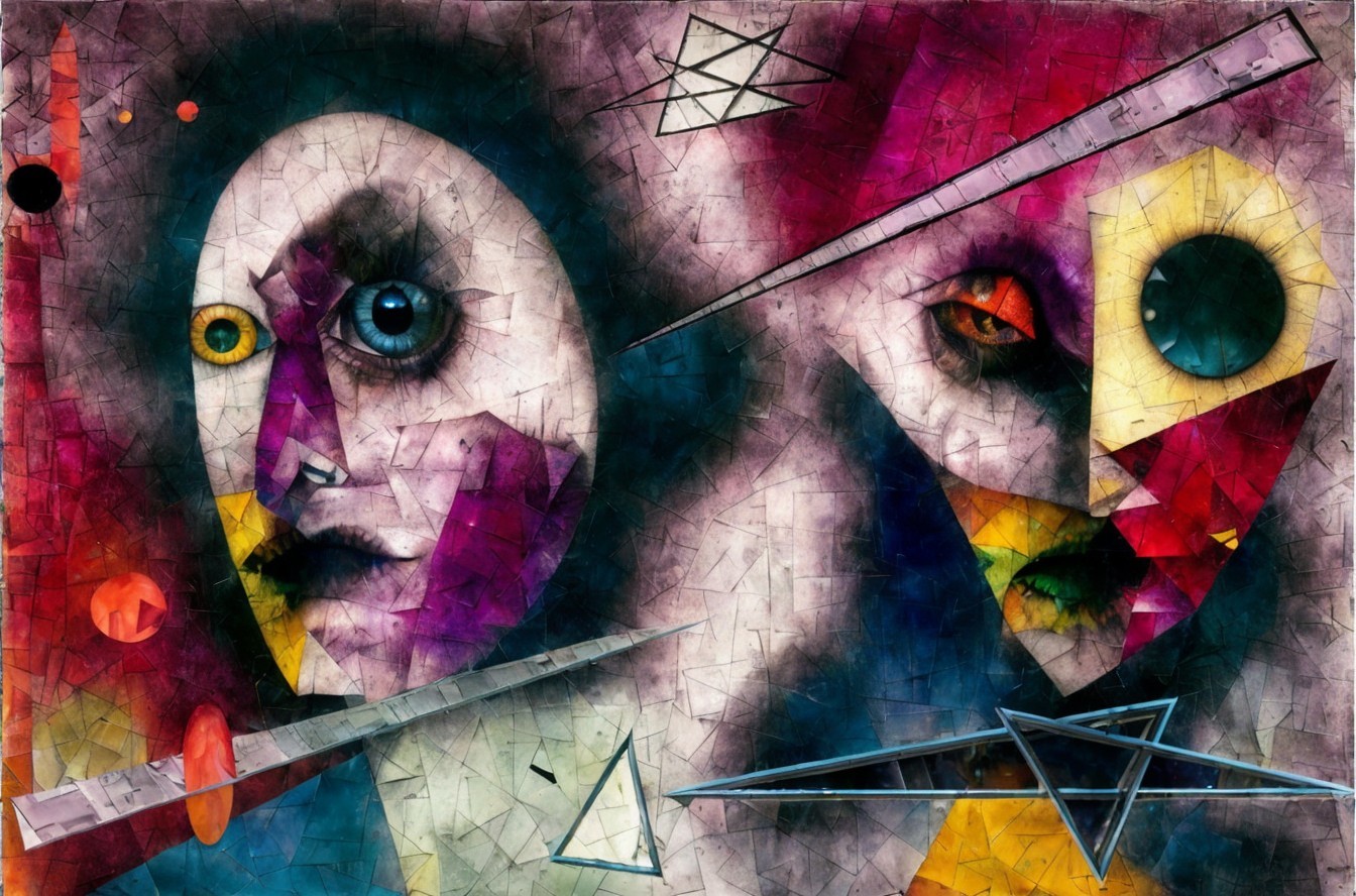 A colorful, abstract painting depicting two faces with mismatched eyes, geometric patterns, and a small figure sitting at the bottom.